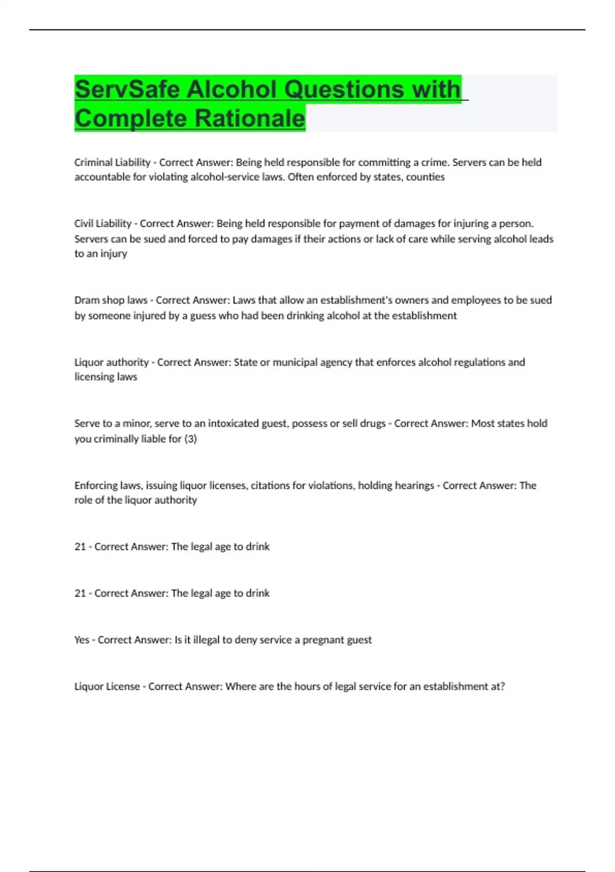 ServSafe Alcohol Questions with Complete Rationale