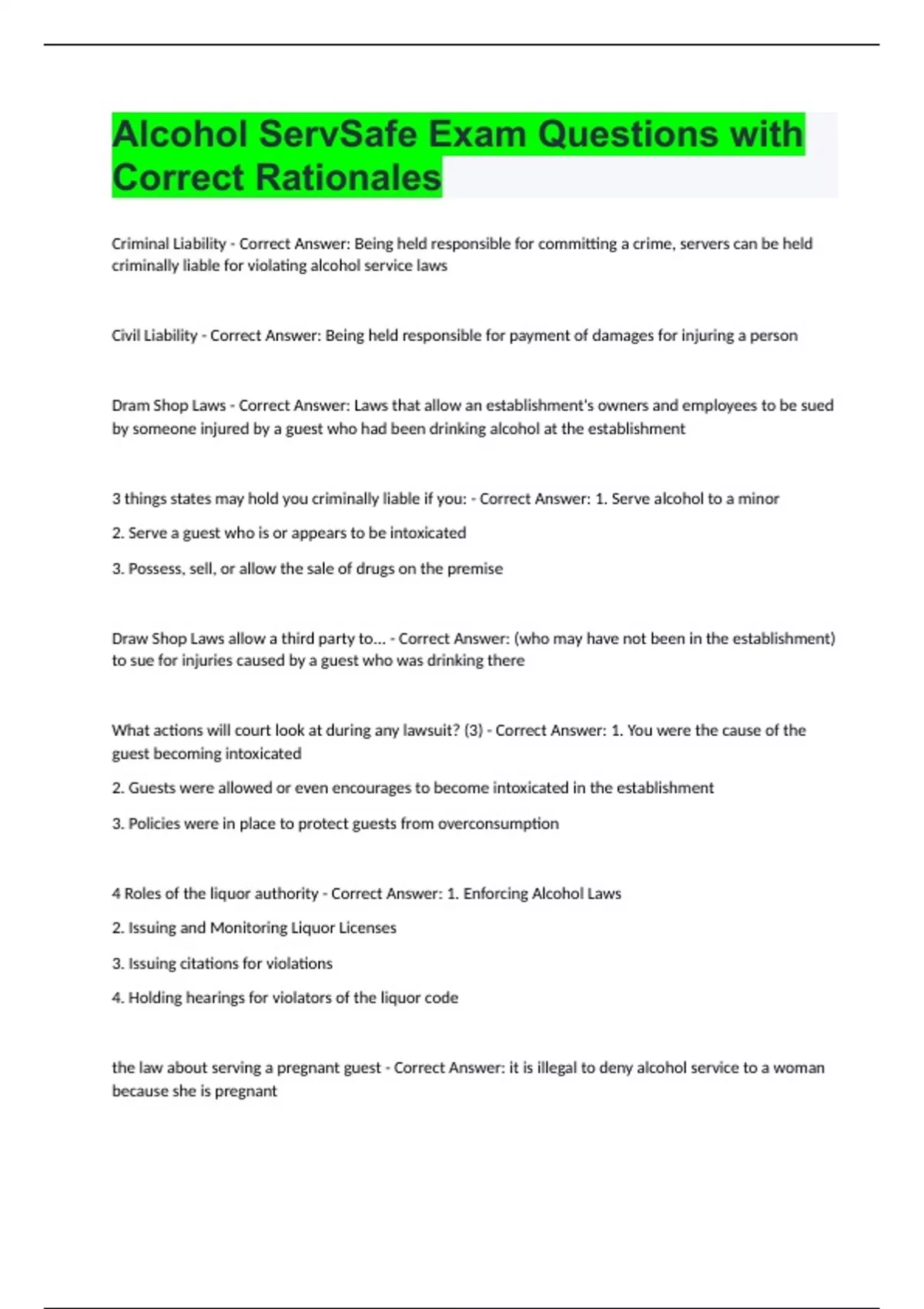 Alcohol ServSafe Exam Questions with Correct Rationales