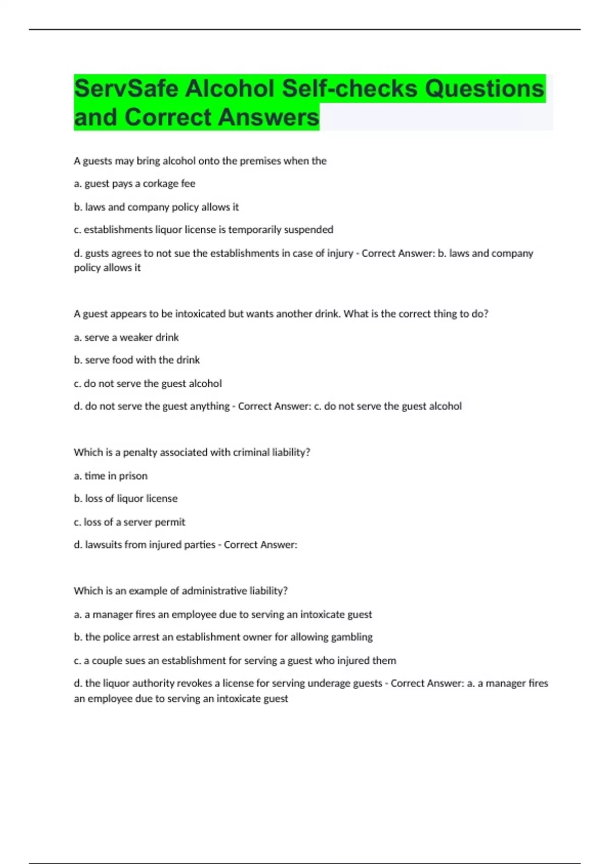 ServSafe Alcohol Self-checks Questions and Correct Answers.