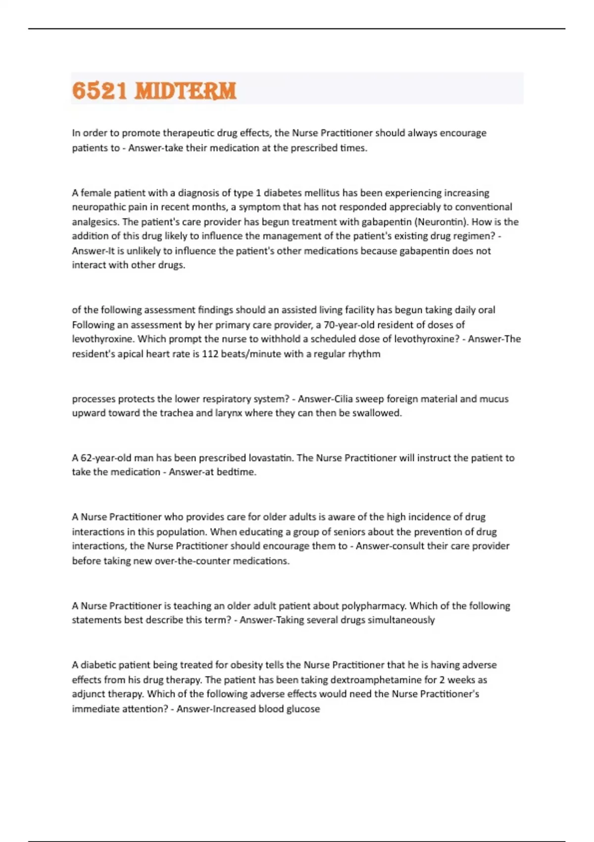 In order to promote therapeutic drug effects, the Nurse Practitioner should always encourage patients to - Answer-take their medication at the prescribed times. A female patient with a diagnosis of type 1 diabetes mellitus has been experiencing increasing neuropathic pain in recent months, a symptom that has not responded appreciably to conventional analgesics. The patient's care provider has begun treatment with gabapentin (Neurontin). How is the addition of this drug likely to influence the management of the patient's existing drug regimen? - Answer-It is unlikely to influence the patient's other medications because gabapentin does not interact with other drugs. of the following assessment findings should an assisted living facility has begun taking daily oral Following an assessment by her primary care provider, a 70-year-old resident of doses of levothyroxine. Which prompt the nurse to withhold a scheduled dose of levothyroxine? - Answer-The resident's apical heart rate is 112 beats/minute with a regular rhythm processes protects the lower respiratory system? - Answer-Cilia sweep foreign material and mucus upward toward the trachea and larynx where they can then be swallowed. A 62-year-old man has been prescribed lovastatin. The Nurse Practitioner will instruct the patient to take the medication - Answer-at bedtime. A Nurse Practitioner who provides care for older adults is aware of the high incidence of drug interactions in this population. When educating a group of seniors about the prevention of drug interactions, the Nurse Practitioner should encourage them to - Answer-consult their care provider before taking new over-the-counter medications. A Nurse Practitioner is teaching an older adult patient about polypharmacy. Which of the following statements best describe this term? - Answer-Taking several drugs simultaneously A diabetic patient being treated for obesity tells the Nurse Practitioner that he is having adverse effects from his drug therapy. The patient has been taking dextroamphetamine for 2 weeks as adjunct therapy. Which of the following adverse effects would need the Nurse Practitioner's immediate attention? - Answer-Increased blood glucoseA 22 year old patient is transitioning from oral agents to insulin. He will be taking 20 units of lantus at bedtime and regular insulin before meals. What instructions should the NP provide about the timing and dose of regular insulin? - Answer-Take 1 unit of regular insulin for each 10 grams of carbohydrate to be consumed 15 minutes before each meal decongestants should not be used chronically (>5 days) because they can cause - Answer-rebound rhinitis/congestion The parents of a 7-year-old boy who has just been diagnosed with allergic asthma are being taught about their son's medication regimen by the nurse. The nurse is currently teaching the parent's about the appropriate use of a "rescue drug" for acute exacerbations of their son's asthma. What drug should the nurse suggests the parents to use in these situations? - Answer-Albuterol A 70-year-old woman with a history of atrial fibrillation takes digoxin and verapamil to control her health problem. Verapamil achieves a therapeutic effect by - Answer-blocking adrenergic receptors and producing antisympathetic effects