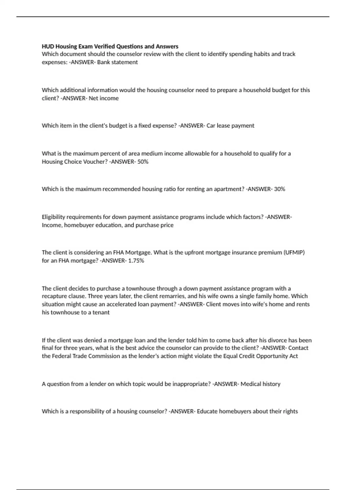 Which document should the counselor review with the client to identify spending habits and track expenses: -ANSWER- Bank statement Which additional information would the housing counselor need to prepare a household budget for this client? -ANSWER- Net income Which item in the client's budget is a fixed expense? -ANSWER- Car lease payment What is the maximum percent of area medium income allowable for a household to qualify for a Housing Choice Voucher? -ANSWER- 50% Which is the maximum recommended housing ratio for renting an apartment? -ANSWER- 30% Eligibility requirements for down payment assistance programs include which factors? -ANSWER- Income, homebuyer education, and purchase price The client is considering an FHA Mortgage. What is the upfront mortgage insurance premium (UFMIP) for an FHA mortgage? -ANSWER- 1.75% The client decides to purchase a townhouse through a down payment assistance program with a recapture clause. Three years later, the client remarries, and his wife owns a single family home. Which situation might cause an accelerated loan payment? -ANSWER- Client moves into wife's home and rents his townhouse to a tenant If the client was denied a mortgage loan and the lender told him to come back after his divorce has been final for three years, what is the best advice the counselor can provide to the client? -ANSWER- Contact the Federal Trade Commission as the lender's action might violate the Equal Credit Opportunity Act A question from a lender on which topic would be inappropriate? -ANSWER- Medical history Which is a responsibility of a housing counselor? -ANSWER- Educate homebuyers about their rights In order to minimize the impact on the client's credit score, what is the maximum time frame within which the client should apply for pre-approval from multiple lenders? -ANSWER- 30-day period. Which is a responsibility of a home inspector? -ANSWER- A) Evaluate condition of the home B) Examine medical systems C) identify items to be repaired or replaced Which is the best reason a counselor would suggest that client speak to three to five difference lenders before choosing one? -ANSWER- So the client can compre loan estimates Which is the best advice that a housing counselor can give to protect against identity theft? -ANSWER- Review credit report at least once a year The client tells the lender that he is expecting a raise soon. Which actions should the lender take? -ANSWER- Provide a loan estimate without factoring in the raise If the client obtains a mortgage of $100,000 typically how much should he expect to pay for closing costs? -ANSWER- $4k - 3-4% on average The client is considering renting an apartment with a different landlord. Which would be an upfront cost of living to the new apartment? -ANSWER- Application fee The client is second-guessing his decision to buy a home, so the counselor asks a series of questions. Which response would be best aligned with the homeownership option for this
