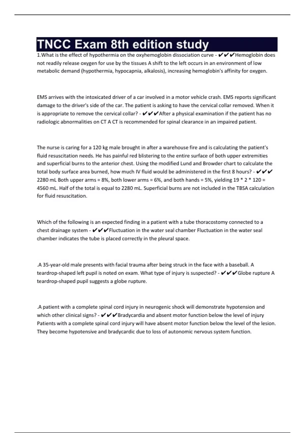 1.What is the effect of hypothermia on the oxyhemoglobin dissociation curve - Hemoglobin does not readily release oxygen for use by the tissues A shift to the left occurs in an environment of low metabolic demand (hypothermia, hypocapnia, alkalosis), increasing hemoglobin's affinity for oxygen. EMS arrives with the intoxicated driver of a car involved in a motor vehicle crash. EMS reports significant damage to the driver's side of the car. The patient is asking to have the cervical collar removed. When it is appropriate to remove the cervical collar? - After a physical examination if the patient has no radiologic abnormalities on CT A CT is recommended for spinal clearance in an impaired patient. The nurse is caring for a 120 kg male brought in after a warehouse fire and is calculating the patient's fluid resuscitation needs. He has painful red blistering to the entire surface of both upper extremities and superficial burns to the anterior chest. Using the modified Lund and Browder chart to calculate the total body surface area burned, how much IV fluid would be administered in the first 8 hours? - 2280 mL Both upper arms = 8%, both lower arms = 6%, and both hands = 5%, yielding 19 * 2 * 120 = 4560 mL. Half of the total is equal to 2280 mL. Superficial burns are not included in the TBSA calculation for fluid resuscitation. Which of the following is an expected finding in a patient with a tube thoracostomy connected to a chest drainage system - Fluctuation in the water seal chamber Fluctuation in the water seal chamber indicates the tube is placed correctly in the pleural space. .A 35-year-old male presents with facial trauma after being struck in the face with a baseball. A teardrop-shaped left pupil is noted on exam. What type of injury is suspected? - Globe rupture A teardrop-shaped pupil suggests a globe rupture. .A patient with a complete spinal cord injury in neurogenic shock will demonstrate hypotension and which other clinical signs? - Bradycardia and absent motor function below the level of injury Patients with a complete spinal cord injury will have absent motor function below the level of the lesion. They become hypotensive and bradycardic due to loss of autonomic nervous system function.