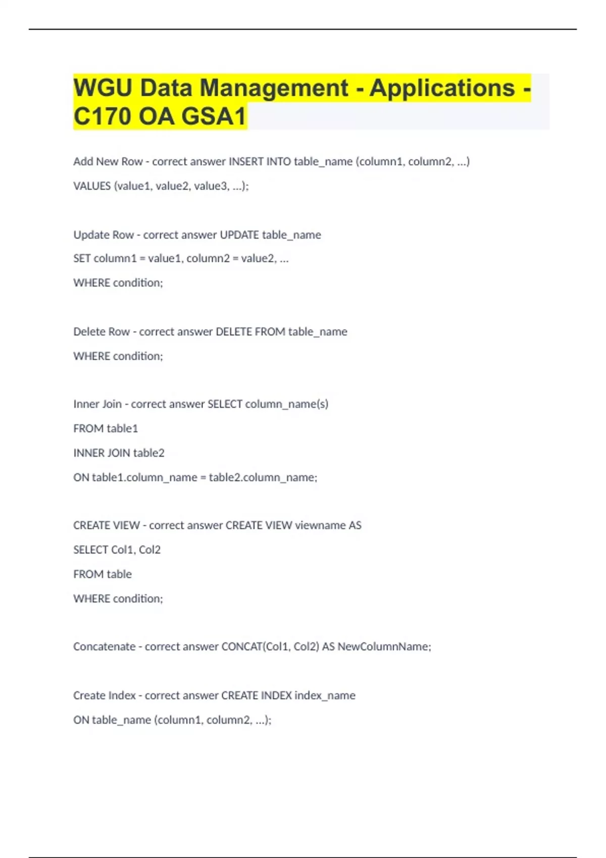 Add New Row - correct answer INSERT INTO table_name (column1, column2, ...) VALUES (value1, value2, value3, ...); Update Row - correct answer UPDATE table_name SET column1 = value1, column2 = value2, ... WHERE condition; Delete Row - correct answer DELETE FROM table_name WHERE condition; Inner Join - correct answer SELECT column_name(s)