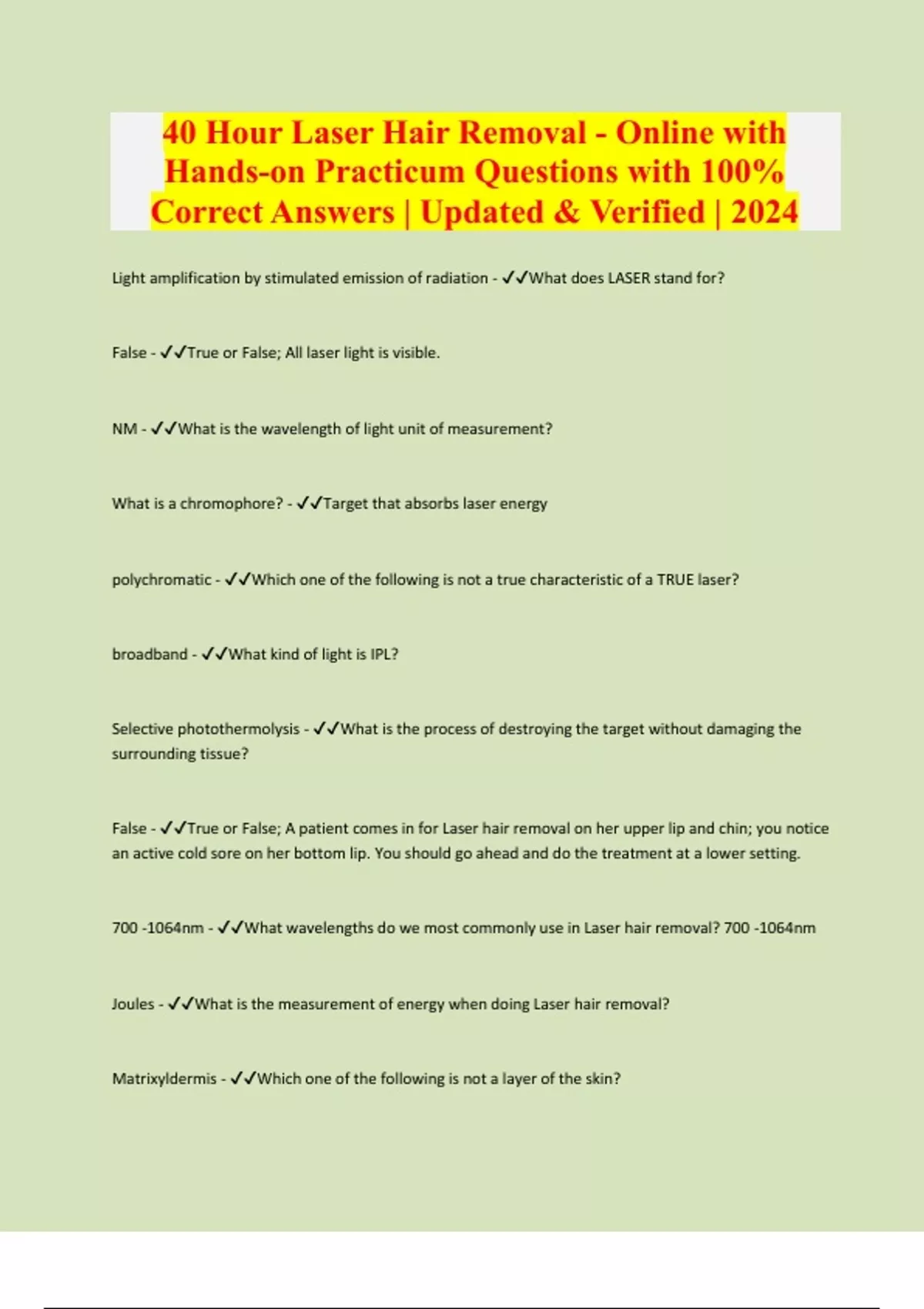 40 Hour Laser Hair Removal - Online with Hands-on Practicum Questions with 100% Correct Answers | Updated & Verified | 2024