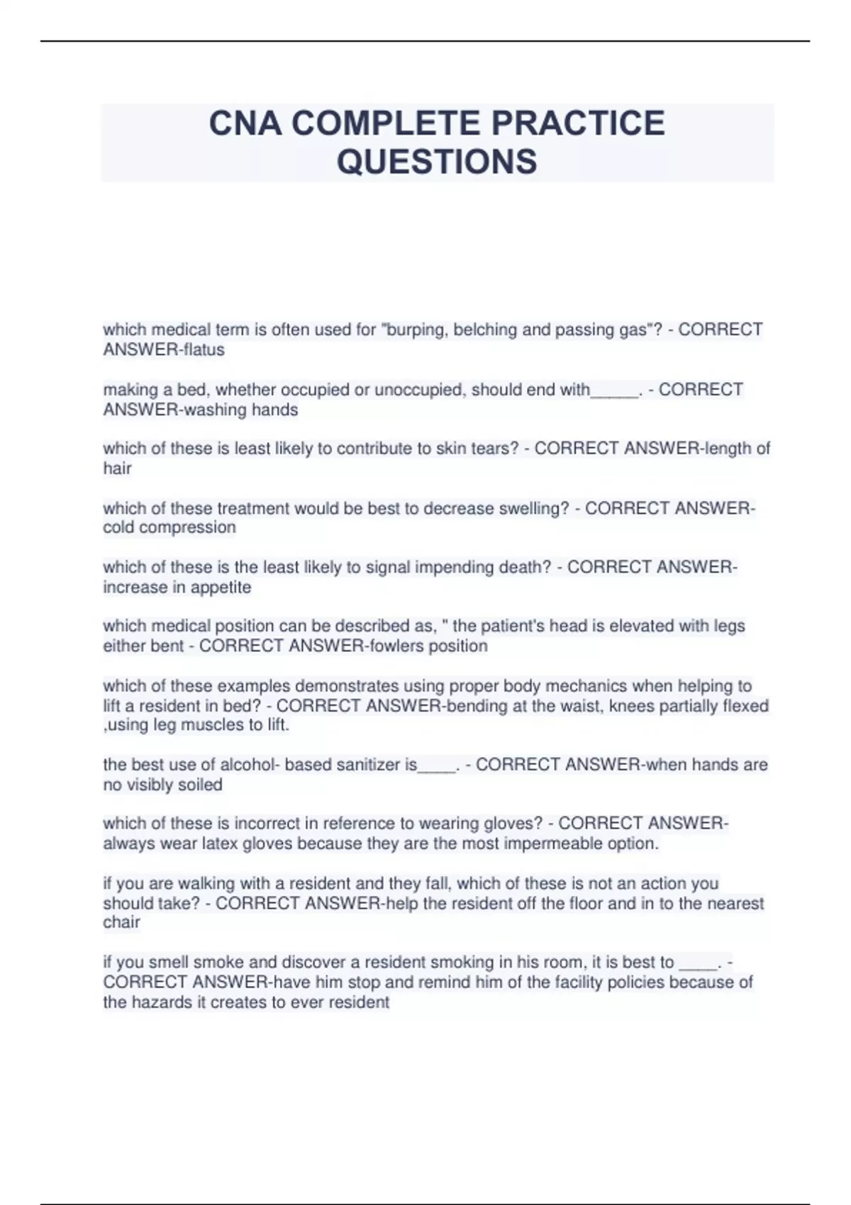 CNA COMPLETE PRACTICE QUESTIONS which medical term is often used for "burping, belching and passing gas"? - CORRECT ANSWER-flatus making a bed, whether occupied or unoccupied, should end with_____. - CORRECT ANSWER-washing hands which of these is least likely to contribute to skin tears? - CORRECT ANSWER-length of hair which of these treatment would be best to decrease swelling? - CORRECT ANSWERcold compression which of these is the least likely to signal impending death? - CORRECT ANSWERincrease in appetite which medical position can be described as, " the patient's head is elevated with legs either bent - CORRECT ANSWER-fowlers position which of these examples demonstrates using proper body mechanics when helping to lift a resident in bed? - CORRECT ANSWER-bending at the waist, knees partially flexed ,using leg muscles to lift. the best use of alcohol- based sanitizer is____. - CORRECT ANSWER-when hands are no visibly soiled which of these is incorrect in reference to wearing gloves? - CORRECT ANSWERalways wear latex gloves because they are the most impermeable option. if you are walking with a resident and they fall, which of these is not an action you should take? - CORRECT ANSWER-help the resident off the floor and in to the nearest chair if you smell smoke and discover a resident smoking in his room, it is best to ____. - CORRECT ANSWER-have him stop and remind him of the facility policies because of the hazards it creates to ever resident A resident is supposed to have 240 milliliters of juice every 2 hours. Which one of these choices would be the most convenient to meet this requirement? - CORRECT ANSWER-8 oz. can of juice all of these might be used dealing with contractures except_____. - CORRECT ANSWER-bandaging hypertension is a medical term for____. - CORRECT ANSWER-high blood pressure to minimize the spread of bacteria, further infection, and contamination, which procedure should be used for washing the perineum of a resident with a catheter? - CORRECT ANSWER-was from the meatus out which of these should not be part of the process for cleaning a resident dentures? - CORRECT ANSWER-placing clean dentures on top of a tissue on the resident table. A resident in your care has called you for help. he claim they can't find his dentures. As a nursing assistant, I is your responsibility to____. - CORRECT ANSWER-notify the supervising nurse applying friction in the handwashing process is very important. according to CDC recommendations, the scrubbing portion of hand washing should take____. - CORRECT ANSWER-20 seconds all of these precautions should be followed when using a transefer- gait belt, except_____. - CORRECT ANSWER-not worrying about proper body mechanics which of these is considered an accurate method for counting respiration rate? - CORRECT ANSWER-the nursing assistant looks at the residents abdomen and a watch at the same time. the medical term tetraplegia- meaning paralysis of all four extremities- is often used interchangeably with the term_____. - CORRECT ANSWER-quadriplegia which of these is not true when taking a blood pressure reading? - CORRECT ANSWER-the optimum position for the resident is lying down with his or her feet elevated a resident has the following symptoms: dizziness, feeling fait, blood pressure below 90/60 and cold, sweaty skin. the resident is most likely suffering from____. - CORRECT ANSWER-hypotension the normal pulse rate for an adult is 60-100 beats per minute. the normal pulse rate for children is ____. - CORRECT ANSWER-70-120 beats per minute alcohol based hand cleanser is appropriate for all of these situations except______. - CORRECT ANSWER-when hands have observable dirt. which of these is not true about the proper procudere for taking a tympanic membrane temperature with an electric thermometer? - CORRECT ANSWER-be sure the ear is free of cerumen (earwax) before inserting the unit. If you are helping a resident put on a clean night shirt and it falls to the ground before you get started, it is best to: - CORRECT ANSWER-put the shirt in the hamper for cleaning and get another clean garment colvusions are associated with___. - CORRECT ANSWER-a seizure when muscle tissues shorten and then a joint becomes hard to move it is called ____. - CORRECT ANSWER-a contracture which of these tasks related to intravenous therapy is in the scope of responsibilities for a nursing assistant? - CORRECT ANSWER-watch the drip and report any problems to obtain the most accurate patient weight, the nursing assistant should weigh the patient_____. - CORRECT ANSWER-3-4 hours after eating. a nursing assistant is instructed to take the oral temperature of a patine who just had a cold drink. the patient's temperature should be taken____. - CORRECT ANSWER-15 minutes after the drink was finished a nursing assistant is caring for a patient with MRSA and is wearing a gown and gloves whenever she provides the patient care. when she needs to go care for another patient she should dispose of her gown and gloves___. - CORRECT ANSWER-in the current patient's room another term for decubitus ulcer is - CORRECT ANSWER-pressure sore why is taking a resident's oral temperature the most commond means of obtaining a reading? - CORRECT ANSWER-it offers the most ease of access and least inconvenience to the resident when transferring a resident from a wheelchair to stationary chair, the nursing assistant should stand____. - CORRECT ANSWER-in front of the wheelchair which of these could be considered neglectful when assisting resident with showering? - CORRECT ANSWER-leaving the resident alone so they are motivated to care for themselves.