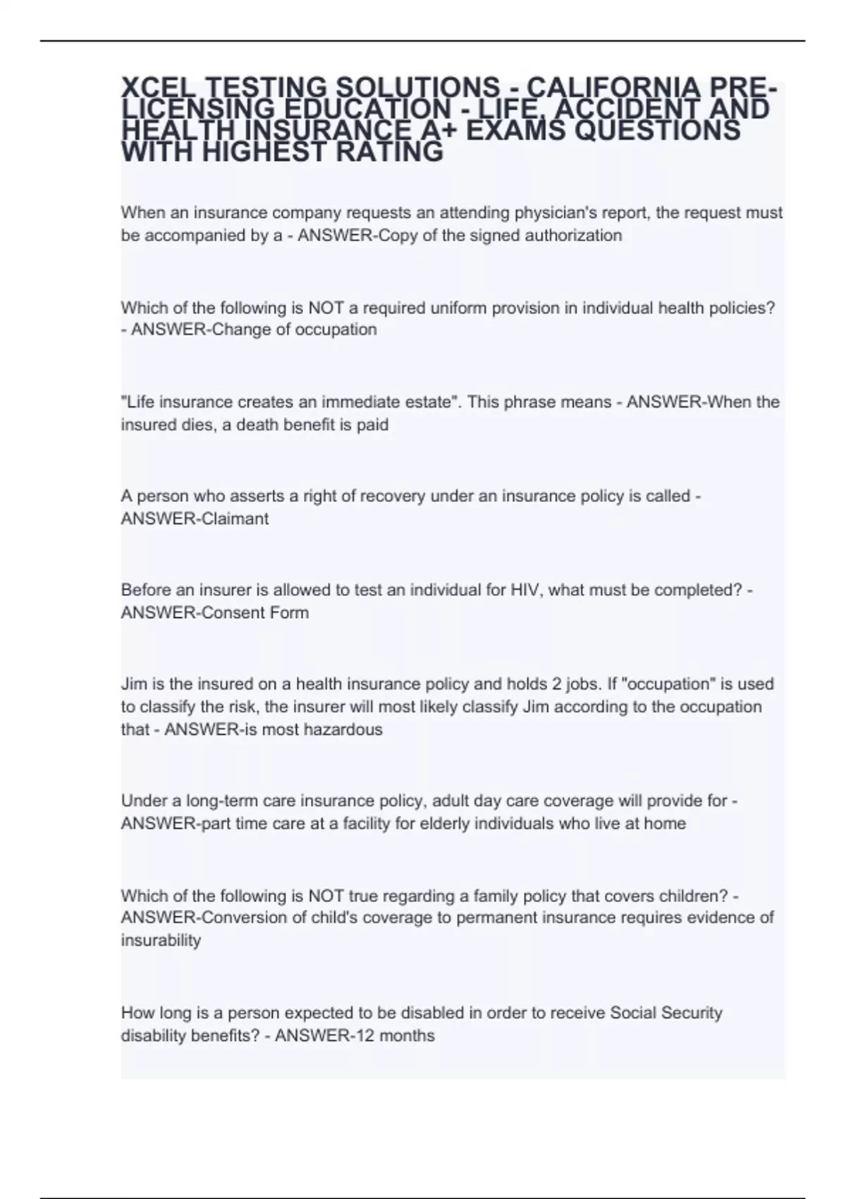When an insurance company requests an attending physician's report, the request must be accompanied by a - ANSWER-Copy of the signed authorization Which of the following is NOT a required uniform provision in individual health policies? - ANSWER-Change of occupation "Life insurance creates an immediate estate". This phrase means - ANSWER-When the insured dies, a death benefit is paid A person who asserts a right of recovery under an insurance policy is called - ANSWER-Claimant Before an insurer is allowed to test an individual for HIV, what must be completed? - ANSWER-Consent Form Jim is the insured on a health insurance policy and holds 2 jobs. If "occupation" is used to classify the risk, the insurer will most likely classify Jim according to the occupation that - ANSWER-is most hazardous Under a long-term care insurance policy, adult day care coverage will provide for - ANSWER-part time care at a facility for elderly individuals who live at home Which of the following is NOT true regarding a family policy that covers children? - ANSWER-Conversion of child's coverage to permanent insurance requires evidence of insurability