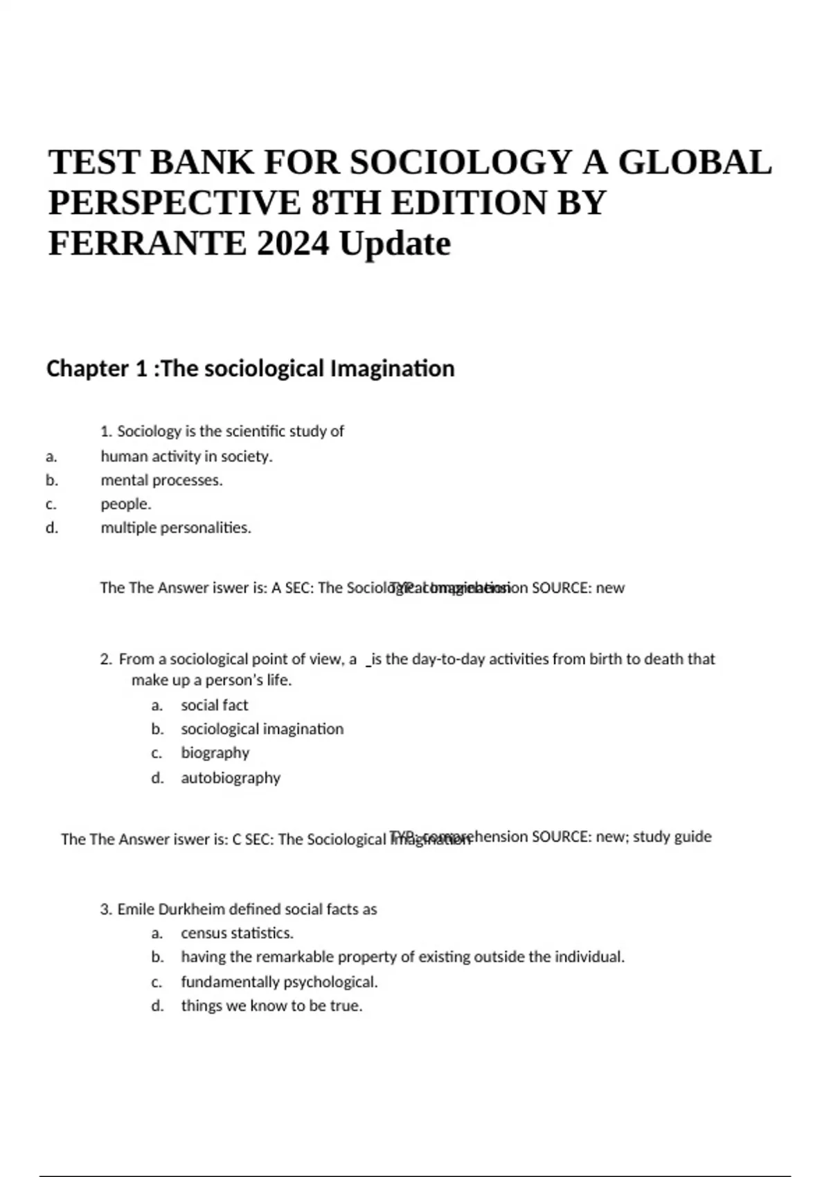 Chapter 1 :The sociological Imagination 1. Sociology is the scientific study of a. human activity in society. b. mental processes. c. people. d. multiple personalities. The The Answer iswer is: A SEC: The Sociological Imagination TYP: comprehension SOURCE: new 2. From a sociological point of view, a is the day-to-day activities from birth to death that make up a person’s life. a. social fact b. sociological imagination c. biography d. autobiography The The Answer iswer is: C SEC: The Sociological Imagination TYP: comprehension SOURCE: new; study guide 3. Emile Durkheim defined social facts as a. census statistics. b. having the remarkable property of existing outside the individual. c. fundamentally psychological. d. things we know to be true. TEST BANK FOR SOCIOLOGY A GLOBAL PERSPECTIVE 8TH EDITION BY FERRANTE 2024 Update The The Answer iswer is: B SEC: The Sociological Imagination TYP: knowledge 4. Only when people do they come to know the power of social facts. a. grow older b. cooperate c. comply d. rebel against the established ways of doing things The The Answer iswer is: D SEC: The Sociological Imagination TYP: comprehension 5. Durkheim wrote that he was not forced to speak French or to use the legal currency, but it was impossible for him to do otherwise. Durkheim was writing about a. mechanical solidarity. b. social relativity. c. social facts. d. social interaction. The The Answer iswer is: C SEC: The Sociological Imagination TYP: application 6. Durkheim wrote, “Even when, in fact, I can struggle free from these rules and successfully break them, it is never without being forced to fight against them.” This statement is a reference to a. mechanical solidarity. b. social relativity. c. social facts. d. social interaction. The The Answer iswer is: C SEC: The Sociological Imagination TYP: application 7. “Because I refuse to shave under my arms, I have to pay a price. On a personal level, this price was my mother’s hostility. On a public level, the price is dealing with the stares of strangers.” This statement illustrates a. mechanical solidarity. b. social relativity. c. the power of social facts. d. the idea of double consciousness. The The Answer iswer is: C SEC: The Sociological Imagination TYP: application 8. A woman writes, “I can’t be anything but what my skin color tells people I am. I am black because I look black. It does not matter that my family has a complicated biological heritage.” She is writing about the power of a. social facts. b. troubles. c. the sociological imagination. d. rationalization. The The Answer iswer is: A SEC: The Sociological Imagination TYP: application SOURCE: study guide 9. An American traveling to Ghana, Africa, on business notices that the “men, including the men I was with, hold hands. One day one of the men I was with took my hand as we walked. In order not to offend him, I took his hand in mine.” The American is responding to a(n) a. trouble. b. issue. c. social fact. d. traditional action. The The Answer iswer is: C SEC: The Sociological Imagination TYP: application 10. Sociologists argue that people fall in love a. when they experience a violent, irresistible attraction to another person. b. only once in the course of a lifetime. c. when certain conditions are met. d. with people like themselves. The The Answer iswer is: CSEC: The Sociological Imagination TYP: comprehension 11. In examining patterns of courtship and marriage, sociologists would emphasize which of the following in shaping a couple’s decision to marry? a. the personalities of the couples b. the importance of love c. personal preferences d. social considerations such as age, sex, race, income, etc. The The Answer iswer is: D SEC: The Sociological Imagination TYP: knowledge SOURCE: new 12. Peter L. Berger equates the sociologist with a. a curious observer who, walking down the neighborhood streets of a large city, is fascinated with what he or she cannot see taking place behind the building walls. b. an Internal Revenue Service auditor. c. a judge giving instructions to a jury. d. a talk show host interviewing guests. The The Answer iswer is: A SEC: The Sociological Imagination TYP: knowledge 13. Peter Berger argues that the logic of sociology presupposes a measure of suspicion about the way in which human events are officially interpreted by authorities. This suspicion speaks to , which defines the sociological consciousness. a. solidarity b. the debunking motif c. rationalization d. false consciousness The The Answer iswer is: B SEC: The Sociological Imagination TYP: comprehension 14. “The fascination of sociology lies in the fact that its perspective makes us see in a new light the very world in which we have lived all our lives.” This vision of sociology can be attributed to a. Peter Berger. b. Emile Durkheim. c. C. Wright Mills. d. W.E.B. DuBois. The The Answer iswer is: A SEC: The Sociological Imagination TYP: knowledge 15. The number of mobile phones per 1,000 people in the U.S. has increased steadily each year since the introduction of the mobile phone in 1985. A sociologist studying these rates would a. agree that mobile phones are necessary. b. think about the forces behind this increase in mobile phone use. c. contemplate the individual reasons for owning a mobile phone. d. wonder how cell phone manufacturers keep up with demand. The The Answer iswer is: B SEC: The Sociological Imagination TYP: comprehension SOURCE : new; study guide 16. Currents of opinion are broadly reflected in a. personal biographies. b. rates summarizing various behaviors. c. advertisements. d. newspaper headlines. The The Answer iswer is: B SEC: The Sociological Imagination TYP: comprehension SOURCE : new; study guide 17. Suicide rates represent one example of what Durkheim would call a. social statics. b. toubles. c. social dynamics. d. currents of opinion. The The Answer iswer is: D SEC: The Sociological Imagination TYP: application SOURCE : new 18. The quality 