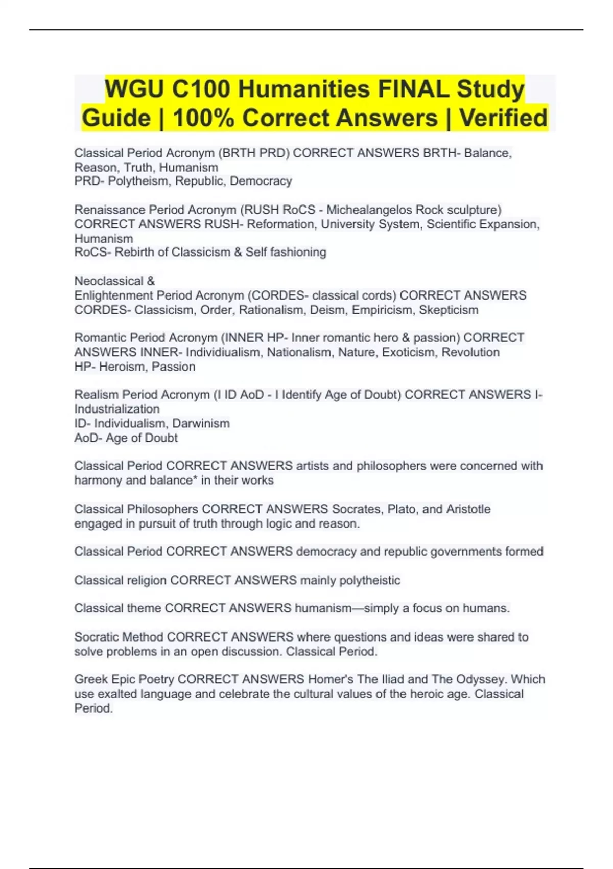 WGU C100 Humanities FINAL Study Guide | 100% Correct Answers | Verified