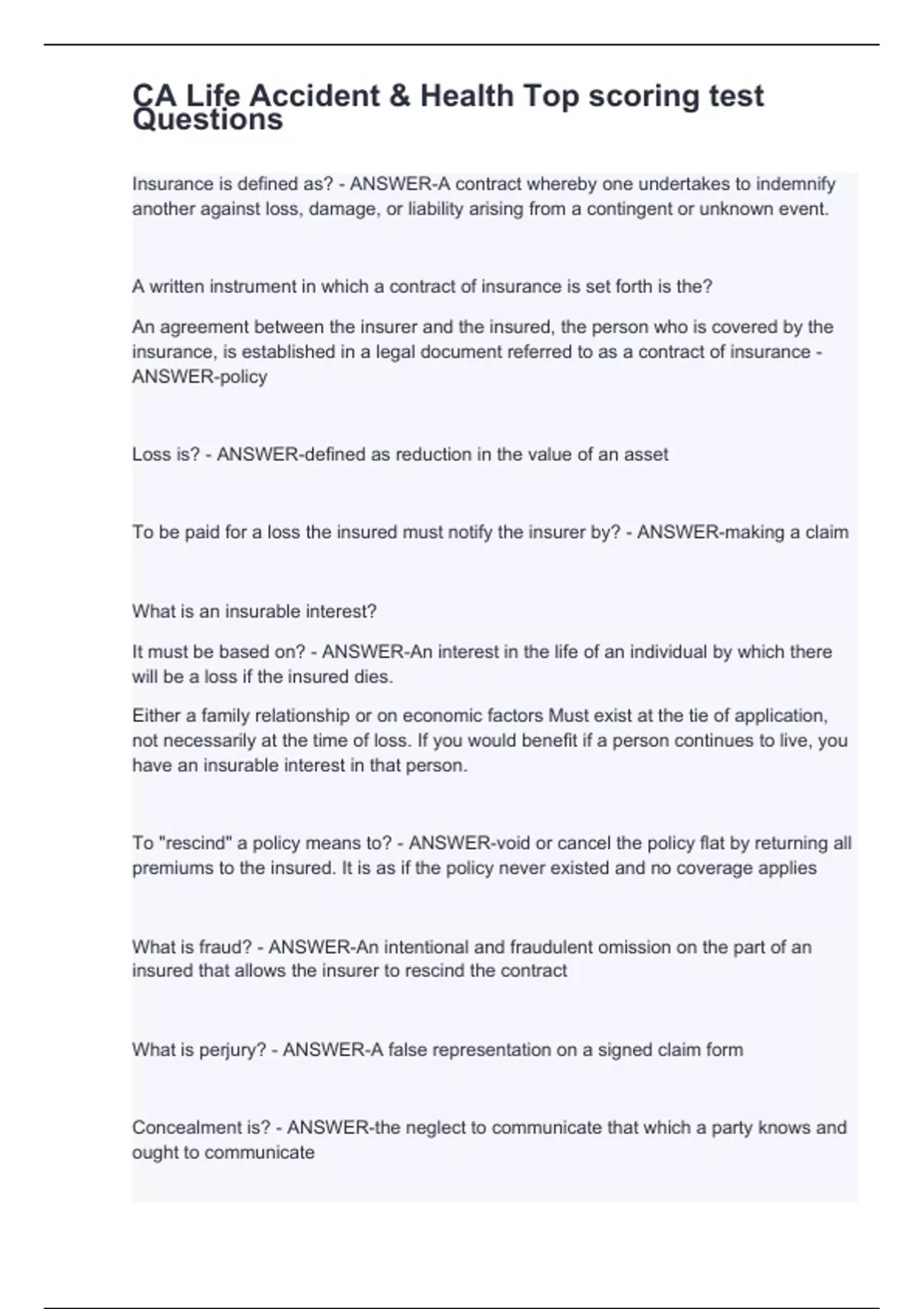 Insurance is defined as? - ANSWER-A contract whereby one undertakes to indemnify another against loss, damage, or liability arising from a contingent or unknown event. A written instrument in which a contract of insurance is set forth is the? An agreement between the insurer and the insured, the person who is covered by the insurance, is established in a legal document referred to as a contract of insurance - ANSWER-policy Loss is? - ANSWER-defined as reduction in the value of an asset To be paid for a loss the insured must notify the insurer by? - ANSWER-making a claim What is an insurable interest? It must be based on? - ANSWER-An interest in the life of an individual by which there will be a loss if the insured dies. Either a family relationship or on economic factors Must exist at the tie of application, not necessarily at the time of loss. If you would benefit if a person continues to live, you have an insurable interest in that person. To "rescind" a policy means to? - ANSWER-void or cancel the policy flat by returning all premiums to the insured. It is as if the policy never existed and no coverage applies What is fraud? - ANSWER-An intentional and fraudulent omission on the part of an insured that allows the insurer to rescind the contract What is perjury? - ANSWER-A false representation on a signed claim form Concealment is? - ANSWER-the neglect to communicate that which a party knows and ought to communicate