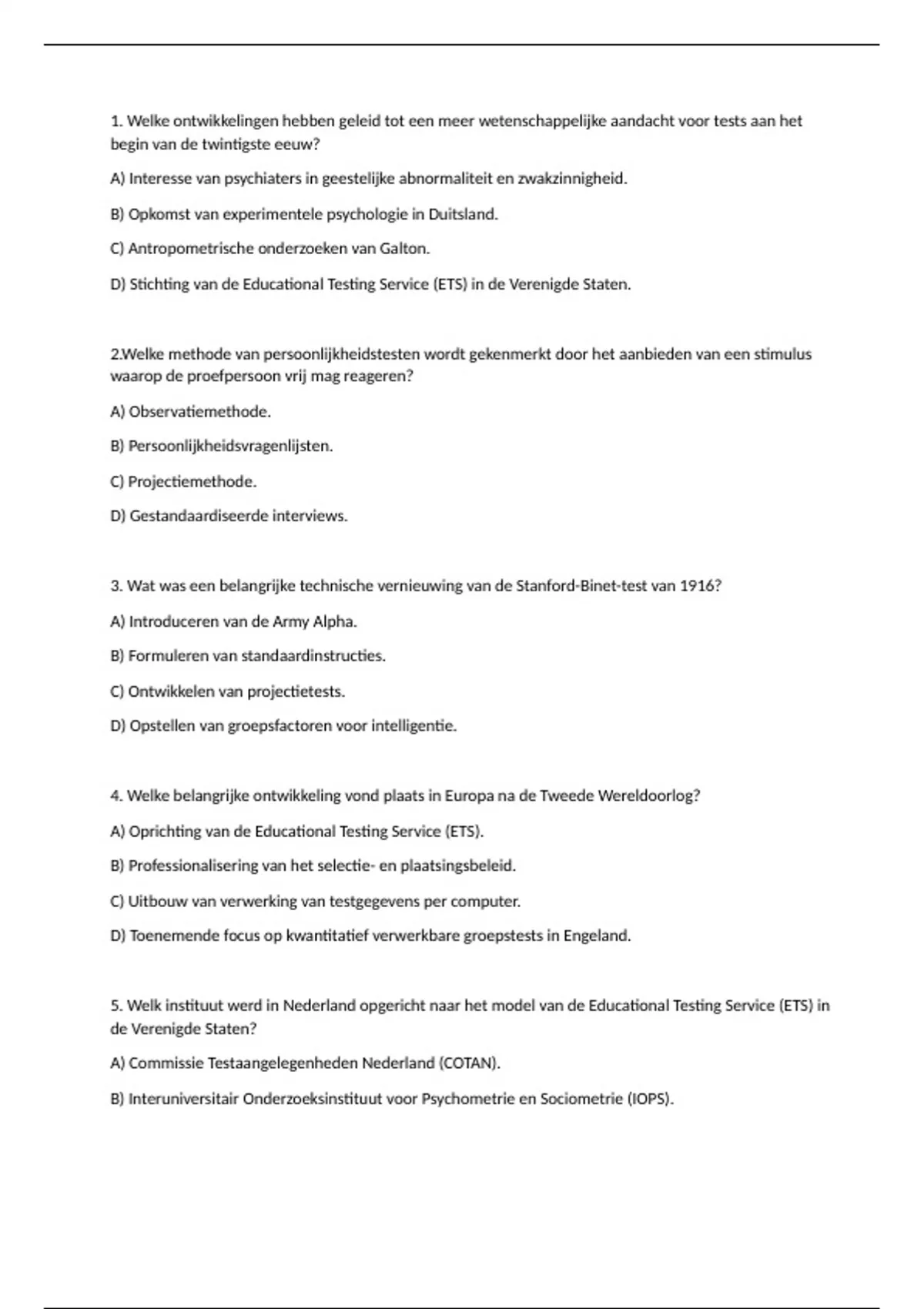 Oefentoets Test- en toetstheorie (PB1502) bestaande uit 50 multiple choice vragen met antwoorden. Vak: Test- en toetstheorie (PB1502) Literatuur: Testtheorie: Inleiding in de theorie van de psychologische test en zijn toepassingen' van P.J.D. Drenth en K. Sijtsma. Succes!
