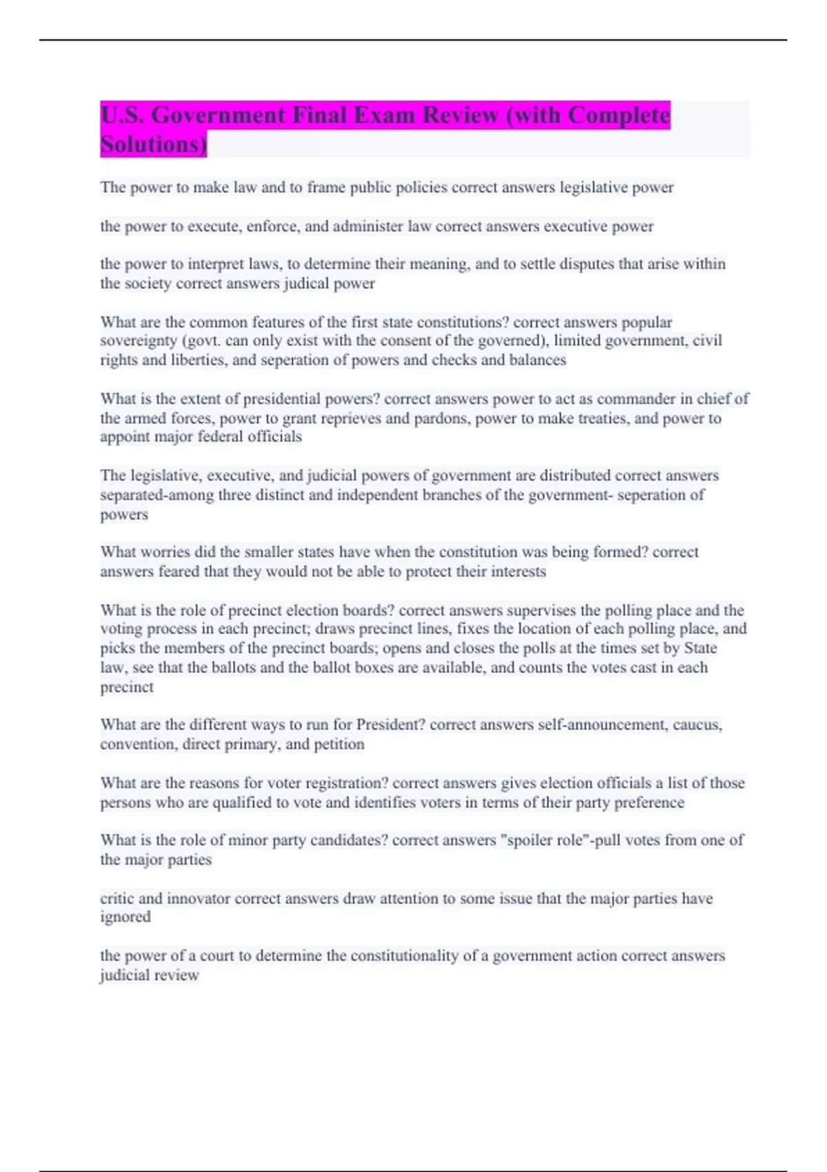 U.S. Government Final Exam Review (with Complete Solutions)
