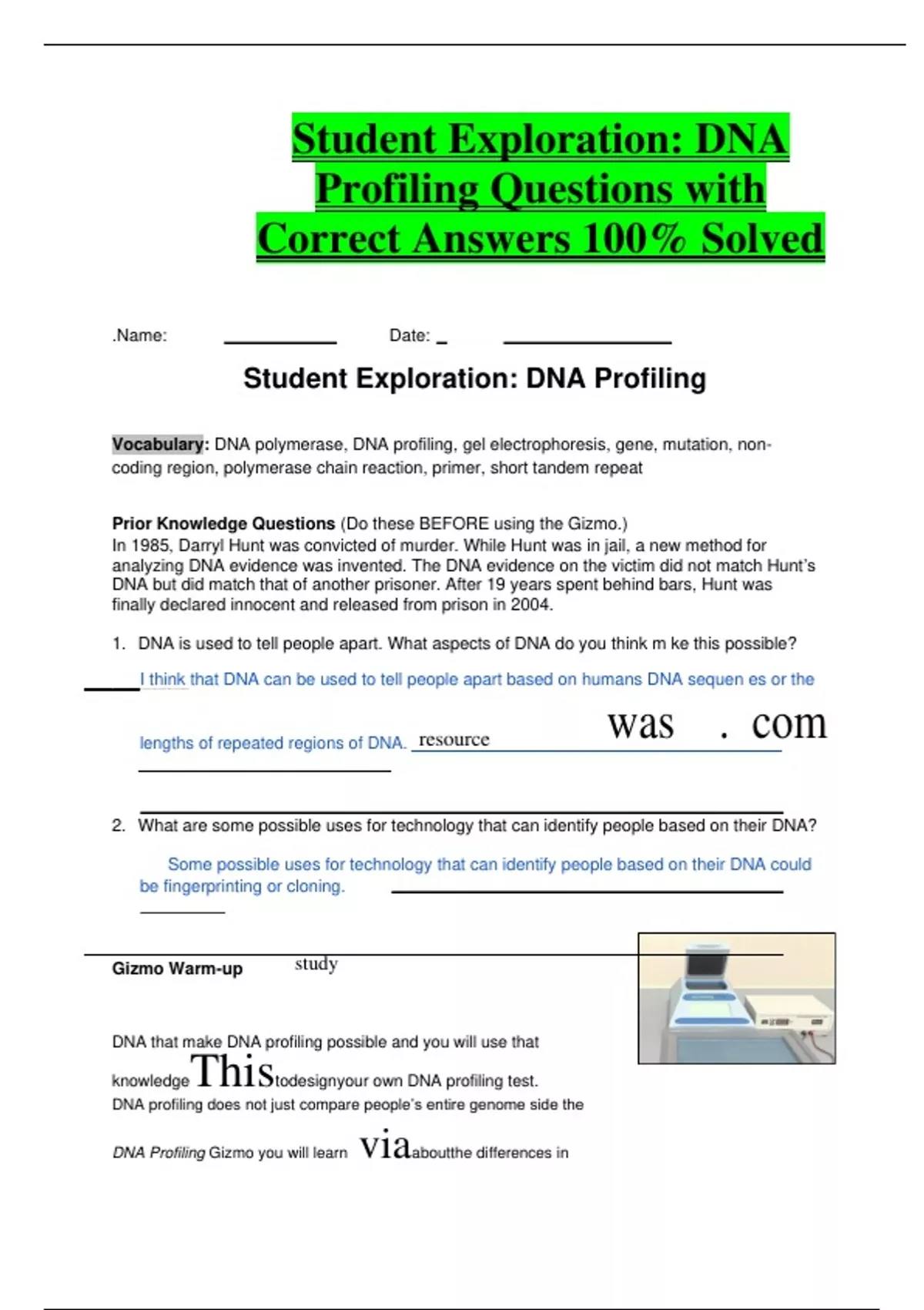 Student Exploration: DNA Profiling Questions with Correct Answers 100% Solved .Name: Date: Student Exploration: DNA Profiling Vocabulary: DNA polymerase, DNA profiling, gel electrophoresis, gene, mutation, noncoding region, polymerase chain reaction, primer, short tandem repeat Prior Knowledge Questions (Do these BEFORE using the Gizmo.) In 1985, Darryl Hunt was convicted of murder. While Hunt was in jail, a new method for analyzing DNA evidence was invented. The DNA evidence on the victim did not match Hunt’s DNA but did match that of another prisoner. After 19 years spent behind bars, Hunt was finally declared innocent and released from prison in 2004. 1. DNA is used to tell people apart. What aspects of DNA do you think m ke this possible? I think that DNA can be used to tell people apart based on humans DNA sequen es or the by side. Instead, a very par ic lar par t of the DN ACourseHerois com par ed. In lengths of repeated regions of DNA. resource was . com 2. What are some possible uses for technology that can identify people based on their DNA? Some possible uses for technology that can identify people based on their DNA could be fingerprinting or cloning.