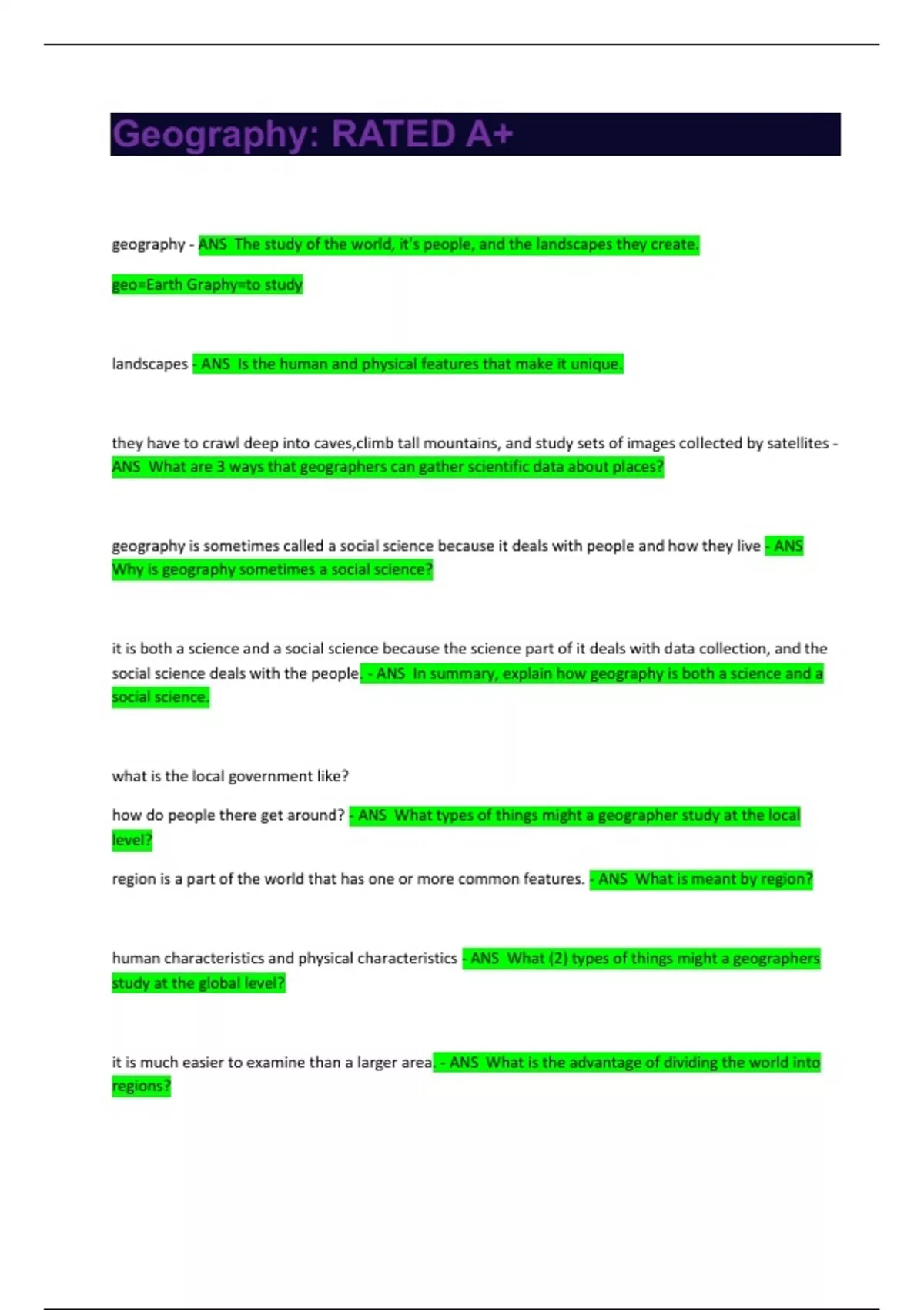 geography - ANS The study of the world, it's people, and the landscapes they create. geo=Earth Graphy=to study landscapes - ANS Is the human and physical features that make it unique. they have to crawl deep into caves,climb tall mountains, and study sets of images collected by satellites - ANS What are 3 ways that geographers can gather scientific data about places? geography is sometimes called a social science because it deals with people and how they live - ANS Why is geography sometimes a social science? it is both a science and a social science because the science part of it deals with data collection, and the social science deals with the people. - ANS In summary, explain how geography is both a science and a social science. what is the local government like? how do people there get around? - ANS What types of things might a geographer study at the local level? region is a part of the world that has one or more common features. - ANS What is meant by region? human characteristics and physical characteristics - ANS What (2) types of things might a geographers study at the global level? it is much easier to examine than a larger area. - ANS What is the advantage of dividing the world into regions?