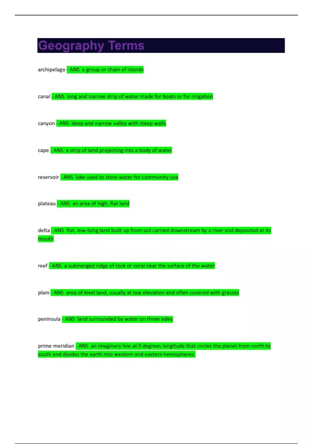 archipelago - ANS a group or chain of islands canal - ANS long and narrow strip of water made for boats or for irrigation canyon - ANS deep and narrow valley with steep walls cape - ANS a strip of land projecting into a body of water reservoir - ANS lake used to store water for community use plateau - ANS an area of high, flat land delta - ANS flat, low-lying land built up from soil carried downstream by a river and deposited at its mouth reef - ANS a submerged ridge of rock or coral near the surface of the water plain - ANS area of level land, usually at low elevation and often covered with grasses peninsula - ANS land surrounded by water on three sides prime meridian - ANS an imaginary line at 0 degrees longitude that circles the planet from north to south and divides the earth into western and eastern hemispheres.