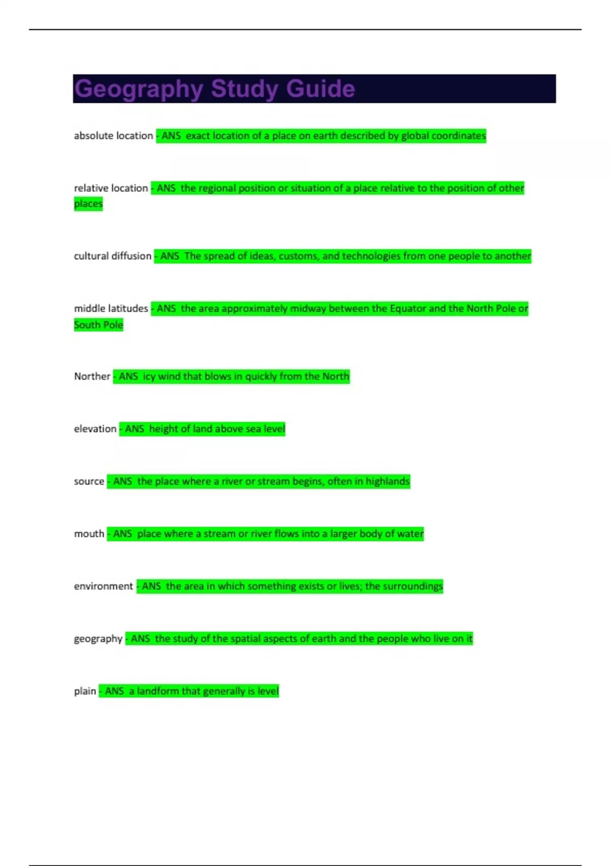 absolute location - ANS exact location of a place on earth described by global coordinates relative location - ANS the regional position or situation of a place relative to the position of other places cultural diffusion - ANS The spread of ideas, customs, and technologies from one people to another middle latitudes - ANS the area approximately midway between the Equator and the North Pole or South Pole Norther - ANS icy wind that blows in quickly from the North elevation - ANS height of land above sea level source - ANS the place where a river or stream begins, often in highlands mouth - ANS place where a stream or river flows into a larger body of water environment - ANS the area in which something exists or lives; the surroundings geography - ANS the study of the spatial aspects of earth and the people who live on it plain - ANS a landform that generally is level