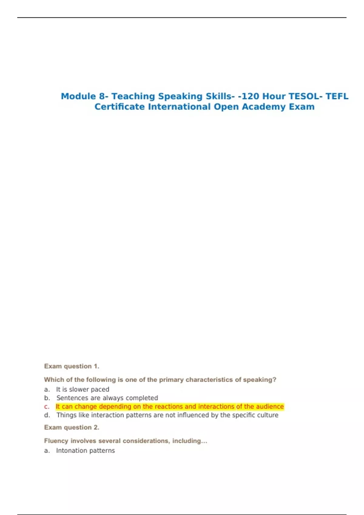 Module 8- Teaching Speaking Skills- -120 Hour TESOL- TEFL Certificate International Open Academy Exam