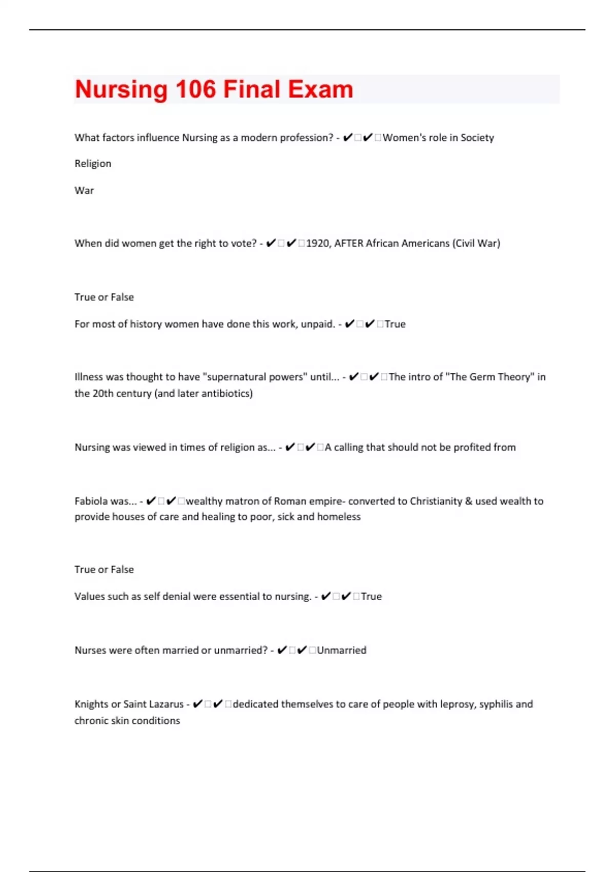 What factors influence Nursing as a modern profession? - ️️Women's role in Society Religion War When did women get the right to vote? - ️️1920, AFTER African Americans (Civil War) True or False For most of history women have done this work, unpaid. - ️️True Illness was thought to have "supernatural powers" until... - ️️The intro of "The Germ Theory" in the 20th century (and later antibiotics) Nursing was viewed in times of religion as... - ️️A calling that should not be profited from Fabiola was... - ️️wealthy matron of Roman empire- converted to Christianity & used wealth to provide houses of care and healing to poor, sick and homeless True or False Values such as self denial were essential to nursing. - ️️True Nurses were often married or unmarried? - ️️Unmarried Knights or Saint Lazarus - ️️dedicated themselves to care of people with leprosy, syphilis and chronic skin conditions
