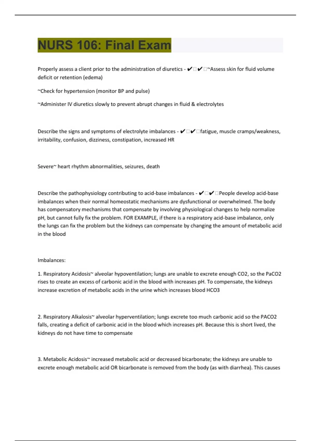 Properly assess a client prior to the administration of diuretics - ️️~Assess skin for fluid volume deficit or retention (edema) ~Check for hypertension (monitor BP and pulse) ~Administer IV diuretics slowly to prevent abrupt changes in fluid & electrolytes Describe the signs and symptoms of electrolyte imbalances - ️️fatigue, muscle cramps/weakness, irritability, confusion, dizziness, constipation, increased HR Severe~ heart rhythm abnormalities, seizures, death Describe the pathophysiology contributing to acid-base imbalances - ️️People develop acid-base imbalances when their normal homeostatic mechanisms are dysfunctional or overwhelmed. The body has compensatory mechanisms that compensate by involving physiological changes to help normalize pH, but cannot fully fix the problem. FOR EXAMPLE, if there is a respiratory acid-base imbalance, only the lungs can fix the problem but the kidneys can compensate by changing the amount of metabolic acid in the blood Imbalances: 1. Respiratory Acidosis~ alveolar hypoventilation; lungs are unable to excrete enough CO2, so the PaCO2 rises to create an excess of carbonic acid in the blood with increases pH. To compensate, the kidneys increase excretion of metabolic acids in the urine which increases blood HCO3 2. Respiratory Alkalosis~ alveolar hyperventilation; lungs excrete too much carbonic acid so the PACO2 falls, creating a deficit of carbonic acid in the blood which increases pH. Because this is short lived, the kidneys do not have time to compensate 3. Metabolic Acidosis~ increased metabolic acid or decreased bicarbonate; the kidneys are unable to excrete enough metabolic acid OR bicarbonate is removed from the body (as with diarrhea). This causes the pH to fall which stimulates chemoreceptors, so the respiratory system compensates with hyperventilation