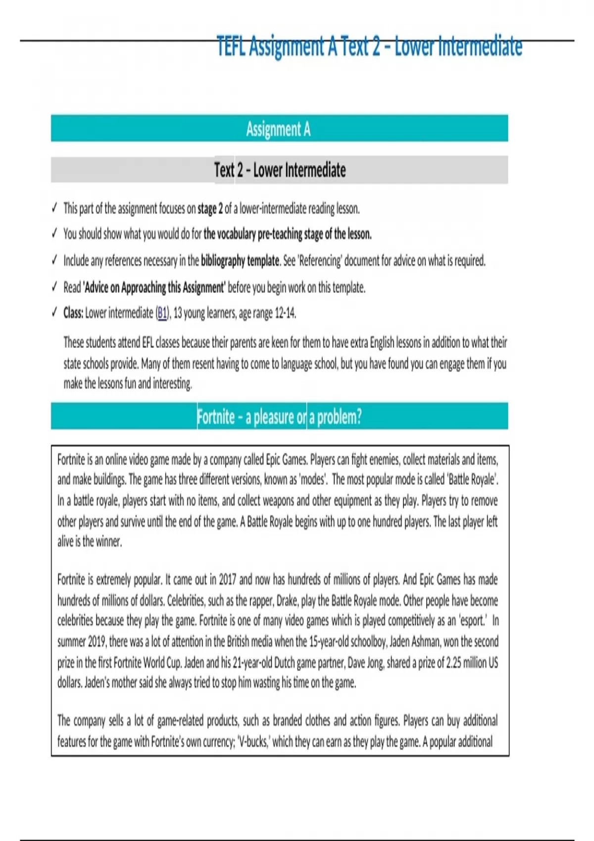 TEFL Assignment A Text 2 – Lower Intermediate This part of the assignment focuses on stage 2 of a lower-intermediate reading lesson. You should show what you would do for the vocabulary pre-teaching stage of the lesson. Include any references necessary in the bibliography template. See 'Referencing' document for advice on what is required. Read 'Advice on Approaching this Assignment' before you begin work on this template. Class: Lower intermediate (B1), 13 young learners, age range 12-14.