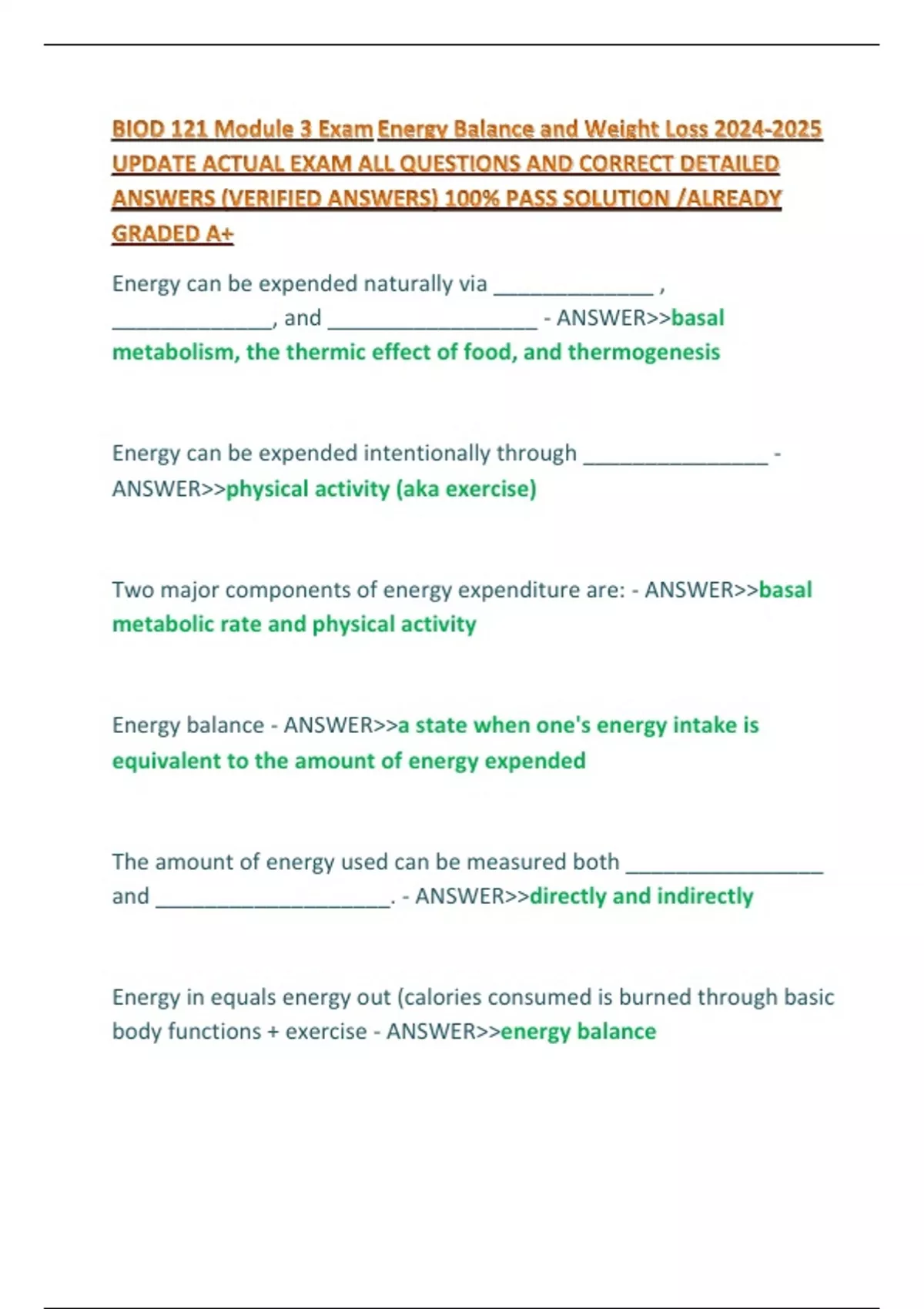 BIOD 121 Module 3 Exam Energy Balance and Weight Loss UPDATE ACTUAL EXAM ALL QUESTIONS AND CORRECT DETAILED ANSWERS (VERIFIED ANSWERS) 100% PASS SOLUTION /ALREADY GRADED A+