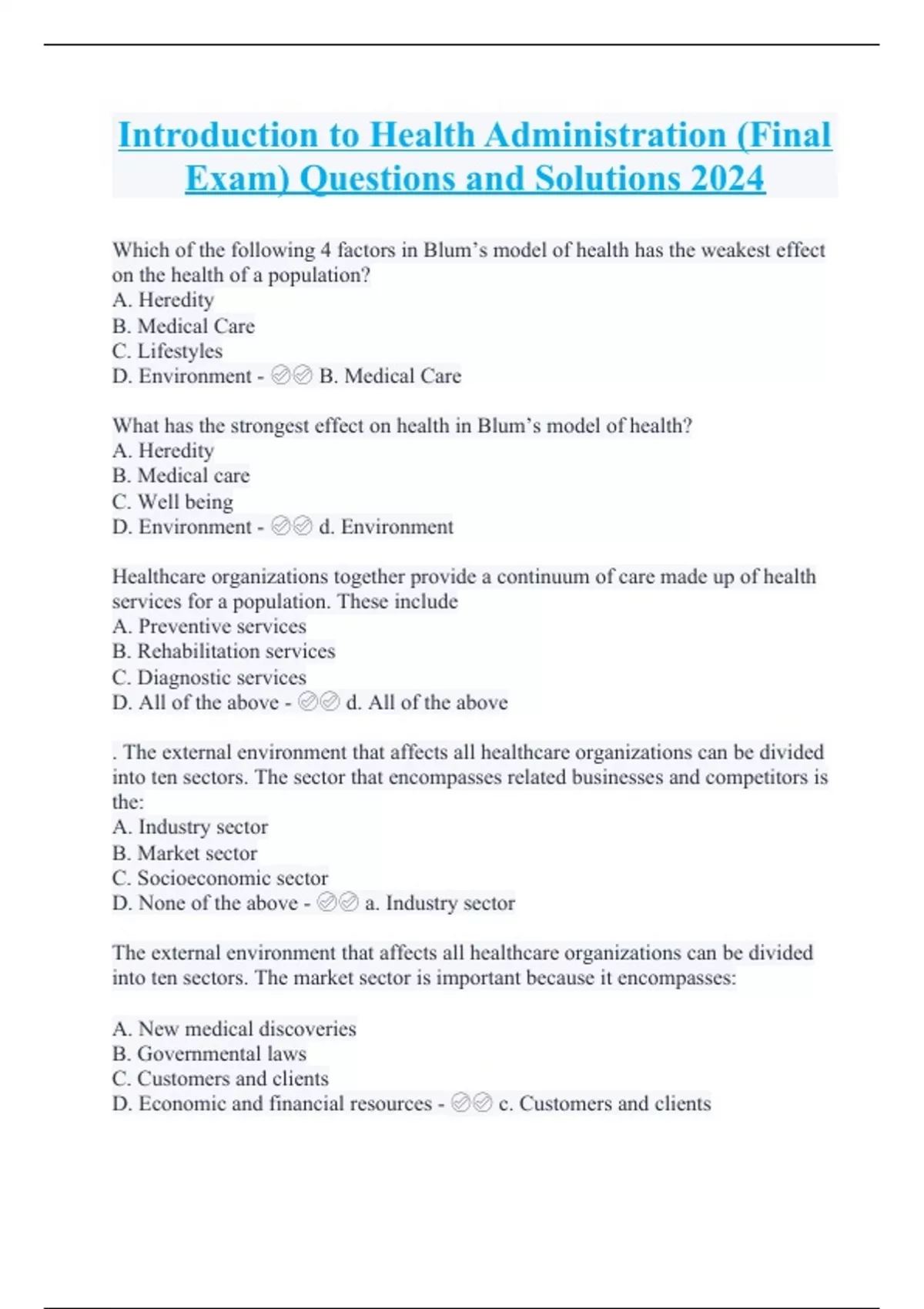 Which of the following 4 factors in Blum’s model of health has the weakest effect on the health of a population? A. Heredity B. Medical Care C. Lifestyles D. Environment - B. Medical Care What has the strongest effect on health in Blum’s model of health? A. Heredity B. Medical care C. Well being D. Environment - d. Environment Healthcare organizations together provide a continuum of care made up of health services for a population. These include A. Preventive services B. Rehabilitation services C. Diagnostic services D. All of the above - d. All of the above . The external environment that affects all healthcare organizations can be divided into ten sectors. The sector that encompasses related businesses and competitors is the: A. Industry sector B. Market sector C. Socioeconomic sector D. None of the above - a. Industry sector The external environment that affects all healthcare organizations can be divided into ten sectors. The market sector is important because it encompasses: A. New medical discoveries B. Governmental laws C. Customers and clients D. Economic and financial resources - c. Customers and clients The health of a population can be thought of in terms of its well-being. Which of the following is not one of the three types of well-being presented in Chapter 1? A. Somatic B. Psychic C. Demographic D. Social - c. Demographic . As defined by the World Health Organization (WHO), health is merely the absence of disease or infirmary. A. True B. False - b. False 8. When planning solutions for health problems experienced by groups of people, managers should keep in mind that disparities are not usually linked to the environment. True False - false . The continuum of care could appropriately be nicknamed "womb to tomb" care because it encompasses health services from the time of a person's birth to the time of the person's death. A. True B. False - true