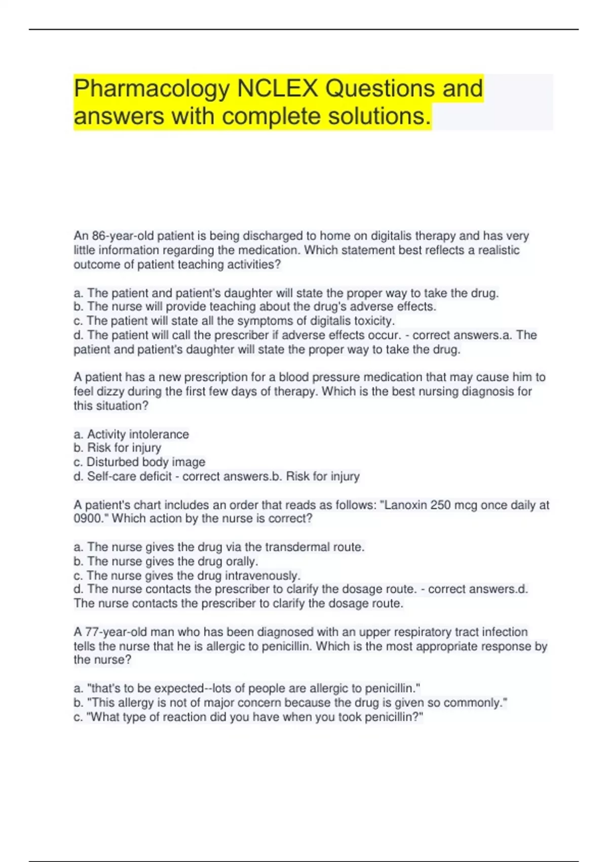 Pharmacology NCLEX Questions and answers with complete solutions. An 86-year-old patient is being discharged to home on digitalis therapy and has very little information regarding the medication. Which statement best reflects a realistic outcome of patient teaching activities? a. The patient and patient's daughter will state the proper way to take the drug. b. The nurse will provide teaching about the drug's adverse effects. c. The patient will state all the symptoms of digitalis toxicity. d. The patient will call the prescriber if adverse effects occur. - correct answers.a. The patient and patient's daughter will state the proper way to take the drug. A patient has a new prescription for a blood pressure medication that may cause him to feel dizzy during the first few days of therapy. Which is the best nursing diagnosis for this situation? a. Activity intolerance b. Risk for injury c. Disturbed body image d. Self-care deficit - correct answers.b. Risk for injury A patient's chart includes an order that reads as follows: "Lanoxin 250 mcg once daily at 0900." Which action by the nurse is correct? a. The nurse gives the drug via the transdermal route. b. The nurse gives the drug orally. c. The nurse gives the drug intravenously. d. The nurse contacts the prescriber to clarify the dosage route. - correct answers.d. The nurse contacts the prescriber to clarify the dosage route. A 77-year-old man who has been diagnosed with an upper respiratory tract infection tells the nurse that he is allergic to penicillin. Which is the most appropriate response by the nurse? a. "that's to be expected--lots of people are allergic to penicillin." b. "This allergy is not of major concern because the drug is given so commonly." c. "What type of reaction did you have when you took penicillin?" d. "Drug allergies don't usually occur in older individuals because they have built up resistance." - correct answers.c. "What type of reaction did you have when you took penicillin?" The nurse is compiling a drug history for a patient. Which question from the nurse will obtain the most information from the patient? a. "Do you depend on sleeping pills to get to sleep?" b. "Do you have a family history of heart disease?" c. "When you have pain, what do you do to relieve it?" d. "What childhood diseases did you have?" - correct answers.c. "When you have pain, what do you do to relieve it?" The nurse is preparing a care plan for a patient who has been newly diagnosed with type 2 diabetes mellitus. Put into correct order the steps of the nursing process, with 1 being the first step and 5 being the last step. a. Implementation b. Planning c. Assessment d. Evaluation e. Nursing diagnoses - correct answers.4, 3, 1, 5, 2 The nurse is reviewing new medication orders that have been written for a newly admitted patient. The nurse will need to clarify which orders? Select all that apply. a. Metformin (Glucophage) 1000 mg PO twice a day b. Sitagliptin (Januvia) 50 mg daily c. Simvastatin (Zocor) 20 mg PO every evening d. Irbesartan (Avapro) 300 mg PO once a day e. Docusate (Colace) as needed for constipation - correct answers.b. Sitagliptin (Januvia) 50 mg daily e. Docusate (Colace) as needed for constipation An elderly woman took a prescription medicine to help her to sleep; however, she felt restless all night and did not sleep at all. The nurse recognizes that this woman has experienced which type of reaction or effect? a. Allergic reaction b. Idiosyncratic reaction c. Mutagenic effect d. Synergistic effect - correct answers.b. Idiosyncratic reaction While caring for a patient with cirrhosis or hepatitis, the nurse knows that abnormalities in which phase of pharmacokinetics may occur?