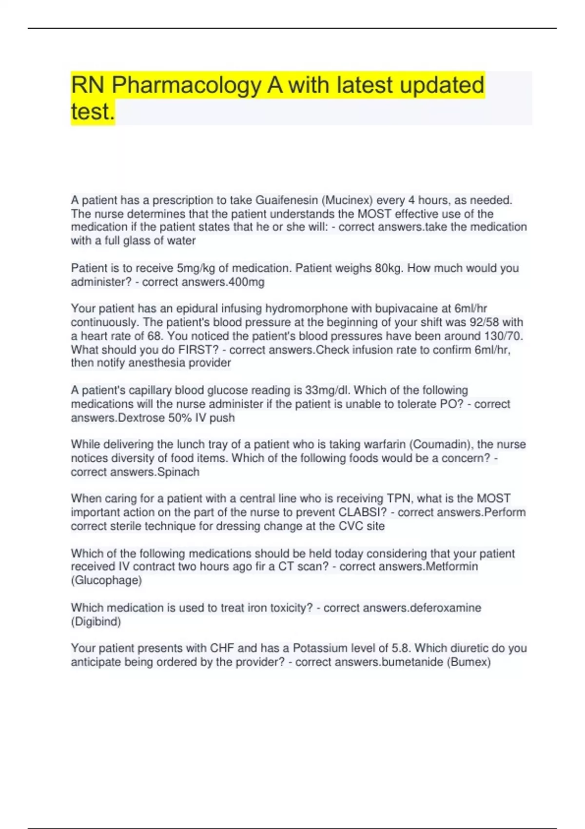 RN Pharmacology A with latest updated test. A patient has a prescription to take Guaifenesin (Mucinex) every 4 hours, as needed. The nurse determines that the patient understands the MOST effective use of the medication if the patient states that he or she will: - correct the medication with a full glass of water Patient is to receive 5mg/kg of medication. Patient weighs 80kg. How much would you administer? - correct answers.400mg Your patient has an epidural infusing hydromorphone with bupivacaine at 6ml/hr continuously. The patient's blood pressure at the beginning of your shift was 92/58 with a heart rate of 68. You noticed the patient's blood pressures have been around 130/70. What should you do FIRST? - correct answers.Check infusion rate to confirm 6ml/hr, then notify anesthesia provider A patient's capillary blood glucose reading is 33mg/dl. Which of the following medications will the nurse administer if the patient is unable to tolerate PO? - correct answers.Dextrose 50% IV push While delivering the lunch tray of a patient who is taking warfarin (Coumadin), the nurse notices diversity of food items. Which of the following foods would be a concern? - correct answers.Spinach When caring for a patient with a central line who is receiving TPN, what is the MOST important action on the part of the nurse to prevent CLABSI? - correct answers.Perform correct sterile technique for dressing change at the CVC site Which of the following medications should be held today considering that your patient received IV contract two hours ago fir a CT scan? - correct answers.Metformin (Glucophage) Which medication is used to treat iron toxicity? - correct oxamine (Digibind) Your patient presents with CHF and has a Potassium level of 5.8. Which diuretic do you anticipate being ordered by the provider? - correct anide (Bumex)
