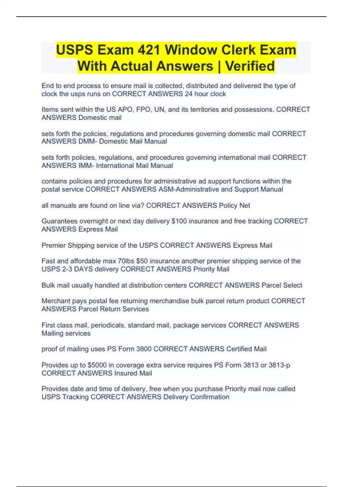 USPS Exam 421 Window Clerk Exam With Actual Answers | Verified