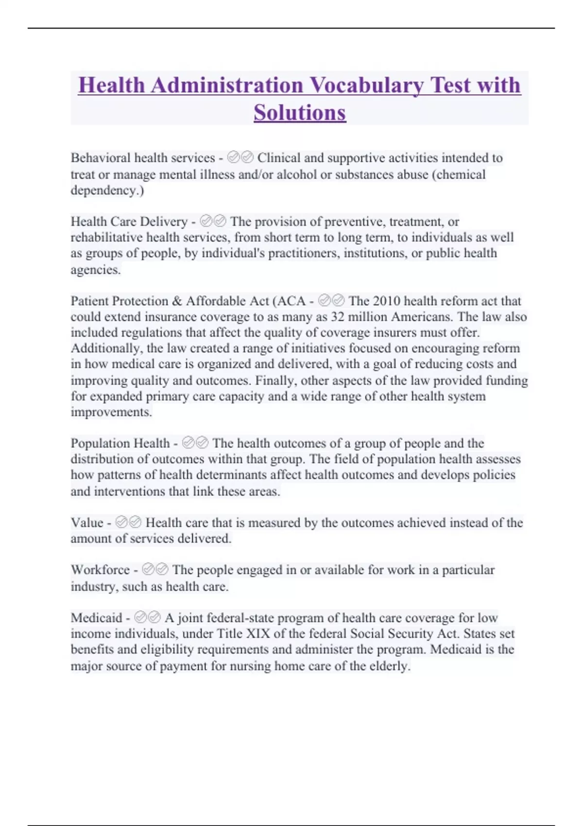 Behavioral health services - Clinical and supportive activities intended to treat or manage mental illness and/or alcohol or substances abuse (chemical dependency.) Health Care Delivery - The provision of preventive, treatment, or rehabilitative health services, from short term to long term, to individuals as well as groups of people, by individual's practitioners, institutions, or public health agencies. Patient Protection & Affordable Act (ACA - The 2010 health reform act that could extend insurance coverage to as many as 32 million Americans. The law also included regulations that affect the quality of coverage insurers must offer. Additionally, the law created a range of initiatives focused on encouraging reform in how medical care is organized and delivered, with a goal of reducing costs and improving quality and outcomes. Finally, other aspects of the law provided funding for expanded primary care capacity and a wide range of other health system improvements. Population Health - The health outcomes of a group of people and the distribution of outcomes within that group. The field of population health assesses how patterns of health determinants affect health outcomes and develops policies and interventions that link these areas. Value - Health care that is measured by the outcomes achieved instead of the amount of services delivered. Workforce - The people engaged in or available for work in a particular industry, such as health care. Medicaid - A joint federal-state program of health care coverage for low income individuals, under Title XIX of the federal Social Security Act. States set benefits and eligibility requirements and administer the program. Medicaid is the major source of payment for nursing home care of the elderly. Medicare - A federal entitlement program of medical and health care coverage for the elderly and disabled and people with end-stage renal disease, governed by Title XVII of the federal Social Security Act and consisting of several parts: Part A for institutional and home care; Part B for physician care; a managed care component (informally called Part C); and Part D, covering prescription drugs. Health systems - Organizations that operate multiple services units under single ownership Horizontal Integration - Affiliations among providers of the same type (e.g. A hospital forming relationships with other hospitals). Vertical Integration - Affiliations among providers of different types (e.g., a clinic, and nursing home forming an affiliation).