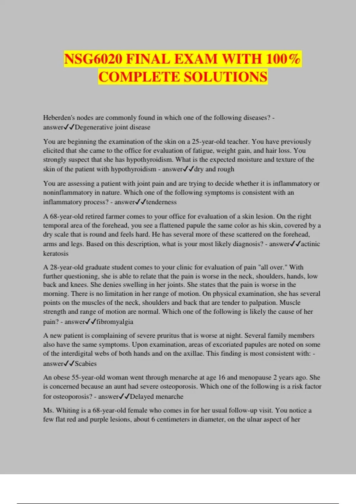 NSG6020 FINAL EXAM WITH 100% COMPLETE SOLUTIONS Heberden's nodes are commonly found in which one of the following diseases? - answerDegenerative joint disease You are beginning the examination of the skin on a 25-year-old teacher. You have previously elicited that she came to the office for evaluation of fatigue, weight gain, and hair loss. You strongly suspect that she has hypothyroidism. What is the expected moisture and texture of the skin of the patient with hypothyroidism - answerdry and rough You are assessing a patient with joint pain and are trying to decide whether it is inflammatory or noninflammatory in nature. Which one of the following symptoms is consistent with an inflammatory process? - answertenderness A 68-year-old retired farmer comes to your office for evaluation of a skin lesion. On the right temporal area of the forehead, you see a flattened papule the same color as his skin, covered by a dry scale that is round and feels hard. He has several more of these scattered on the forehead, arms and legs. Based on this description, what is your most likely diagnosis? - answeractinic keratosis A 28-year-old graduate student comes to your clinic for evaluation of pain "all over." With further questioning, she is able to relate that the pain is worse in the neck, shoulders, hands, low back and knees. She denies swelling in her joints. She states that the pain is worse in the morning. There is no limitation in her range of motion. On physical examination, she has several points on the muscles of the neck, shoulders and back that are tender to palpation. Muscle strength and range of motion are normal. Which one of the following is likely the cause of her pain? - answerfibromyalgia A new patient is complaining of severe pruritus that is worse at night. Several family members also have the same symptoms. Upon examination, areas of excoriated papules are noted on some of the interdigital webs of both hands and on the axillae. This finding is most consistent with: - answerScabies An obese 55-year-old woman went through menarche at age 16 and menopause 2 years ago. She is concerned because an aunt had severe osteoporosis. Which one of the following is a risk factor for osteoporosis? - answerDelayed menarche Ms. Whiting is a 68-year-old female who comes in for her usual follow-up visit. You notice a few flat red and purple lesions, about 6 centimeters in diameter, on the ulnar aspect of her forearms but nowhere else. She doesn't mention them. They are tender when you examine them. What should you do? - answerAsk how she acquired them. A 58-year-old man comes to your office complaining of bilateral back pain that now awakens him at night. This has been steadily increasing for the past 2 months. Which one of the following is the most reassuring in this patient with back pain? - answerPain that is bilateral The Phalen's test is used to evaluate: - answerinflammation of the median nerve Which of the following would lead you to suspect a hydrocele versus other causes of scrotal swelling? - answerA positive transillumination test You are examining a newborn and note that the right testicle is not in the scrotum. What should you do next? - answerAttempt to bring down the testis from the inguinal canal A 50-year-old truck driver comes to yo