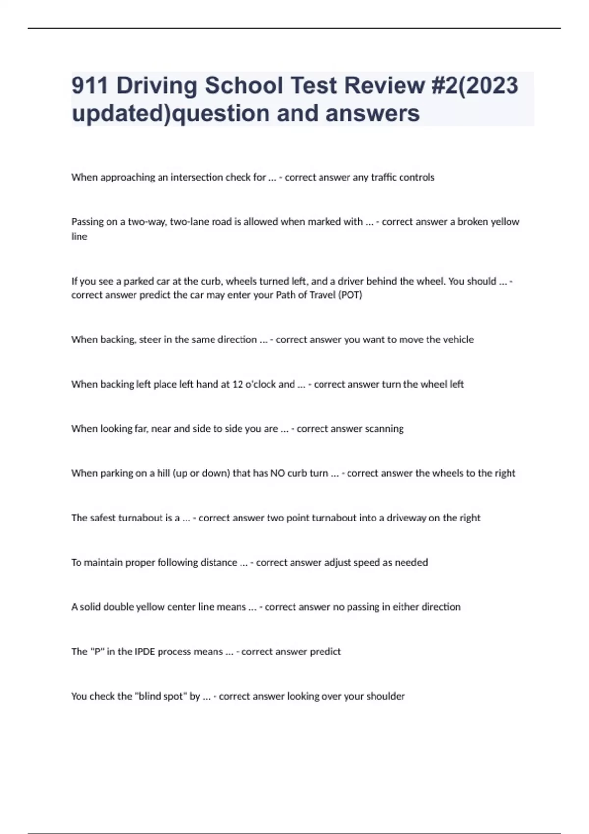 911 Driving School Test Review # Question and answers already passed 2023/2024When approaching an intersection check for ... - correct answer any traffic controls Passing on a two-way, two-lane road is allowed when marked with ... - correct answer a broken yellow line If you see a parked car at the curb, wheels turned left, and a driver behind the wheel. You should ... - correct answer predict the car may enter your Path of Travel (POT) When backing, steer in the same direction ... - correct answer you want to move the vehicle When backing left place left hand at 12 o'clock and ... - correct answer turn the wheel left When looking far, near and side to side you are ... - correct answer scanning When parking on a hill (up or down) that has NO curb turn ... - correct answer the wheels to the right The safest turnabout is a ... - correct answer two point turnabout into a driveway on the right To maintain proper following distance ... - correct answer adjust speed as needed A solid double yellow center line means ... - correct answer no passing in either direction The "P" in the IPDE process means ... - correct answer predict