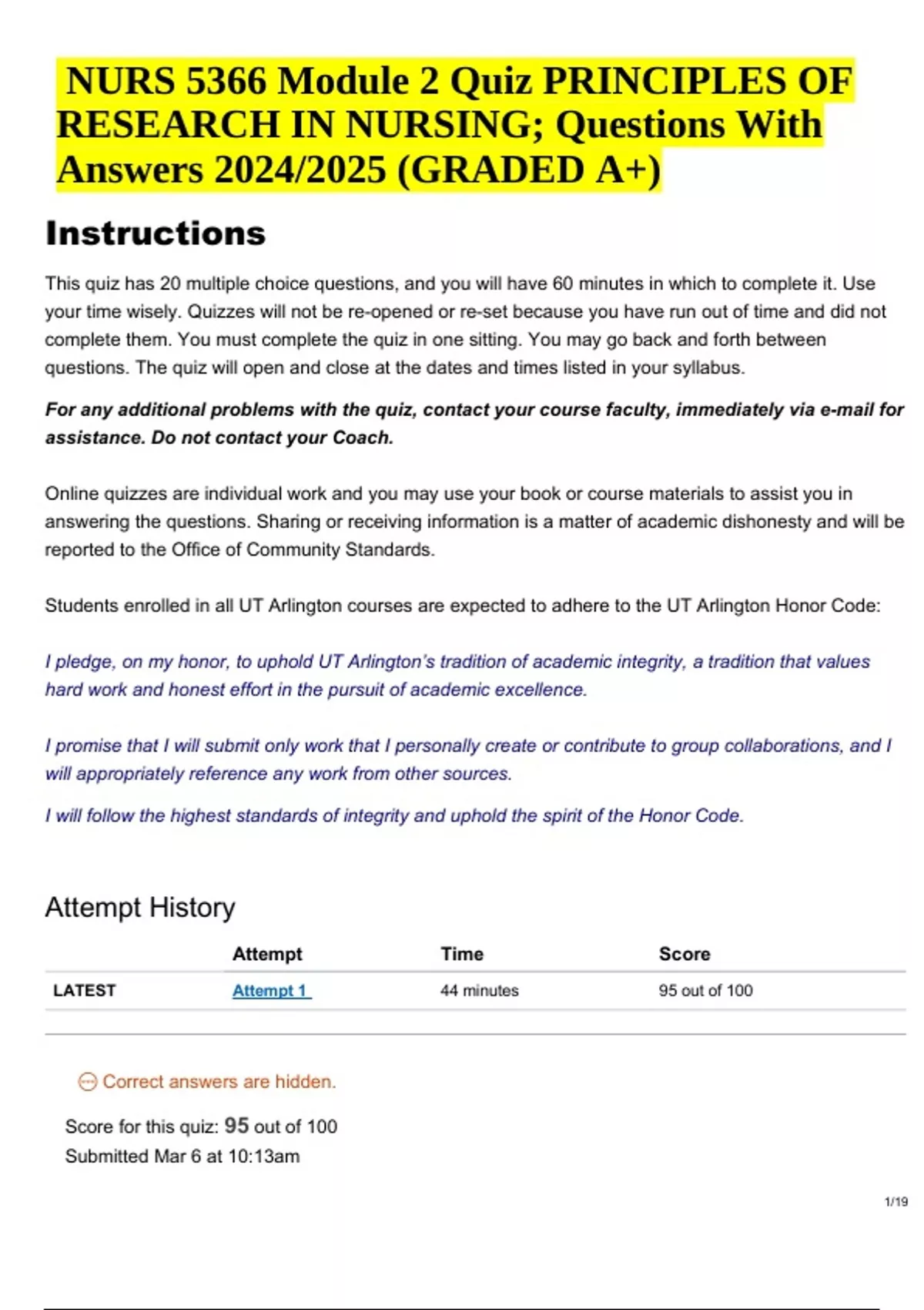 NURS 5366 Module 2 Quiz PRINCIPLES OF RESEARCH IN NURSING; Questions With Answers 2024/2025 (GRADED A+) A stimulus or activity that is measured to examine the effect created by the independent variable best describes a(n) _____ variable. Independent Dependent Demographic Extraneous In quantitative research, the independent variable (intervention, treatment, or experimental variable) is manipulated or varied by the researcher to cause an effect on the dependent variable. The dependent variable (response or outcome variable) is measured to examine the effect created by the independent variable. An independent variable is a stimulus or activity that is manipulated or varied by the researcher to create an effect on the dependent variable. A dependent variable is the response behavior or outcome that the researcher wants to predict or explain. Extraneous variables exist in all studies and can affect the measurement of study variables and the relationships among them. Extraneous variables are of primary concern in quantitative studies, because they can obscure one’s understanding of the relational or causal dynamics within the studies. Demographic variables are attributes of the subjects that are measured during the study and used to describe the sample. 3/19 Question 2 5 / 5 pts A study’s hypothesis that a new surgical approach produces safer outcomes in immunosuppressed patients is tested in a fourteen-site research study across the United States. Subjects at all sites are randomly selected and randomly assigned to experimental versus control groups. What study design is used in this research project? Quasi-experimental design Model testing design Counterbalanced design Randomized controlled trial 4/19 A randomized clinical trial (RCT) contains random assignment to experimental and clinical groups and very often is multi-site. A fully randomized design contains both random selection and random assignment. Quasi-experimental designs facilitate the search for knowledge and examination of causality in situations in which complete control is not possible. Such designs lack a control group, or lack random assignment to group. The model-testing design requires that all variables relevant to the model be measured, using correlational statistics. A large, heterogeneous sample is required. Crossover, or counterbalancing, is a strategy designed to guard against possible erroneous conclusions resulting from carryover effects. With counterbalancing, subjects are randomly assigned to a specific sequencing of treatment conditions. This approach distributes the carryover effects equally throughout all the conditions of the study, thus canceling them out. To prevent an effect related to time, the same amount of time must be allotted to each treatment, and the crossover point must be related to time, not to the condition of the subject. Question 3 5 / 5 pts The director of a major hospital conducts a study to discover the types of critical incidents that have occurred in the the hospital over the past 5 years. She compiles a list of all the critical incidents that occurred during that time. In this study, critical incidents serve as the___________. extraneous variable. study sample. dependent variable. EMAIL ME: 5/19 In quantitative research, the independent variable (intervention, treatment, or experimental variable) is manipulated or varied by the researcher to cause an effect on the dependent variable. The dependent variable (response or outcome variable) is measured to examine the effect created by the independent variable. An independent variable is a stimulus or activity that is manipulated or varied by the researcher to create an effect on the dependent variable. A dependent variable is the response behavior or outcome that the researcher wants to predict or explain. Extraneous variables exist in all studies and can affect the measurement of study variables and the relationships among them. Extraneous variables are of primary concern in quantitative studies, because they can obscure one’s understanding of the relational or causal dynamics within the studies. Demographic variables are attributes of the subjects that are measured during the study and used to describe the sample. Incorrect Question 4 0 / 5 pts How does a comparative descriptive design differ from a typical descriptive design? It examines the relationship between multiple variables, whereas a typical descriptive design only evaluates the effect of one independent variable on one dependent variable. It differs in name only; they are essentially the same design. It compares changes in phenomenon over time, whereas the typical descriptive design focuses on only one time period. It describes data from two different groups, whereas a typical descriptive design focuses on a single group. EMAIL ME: 6/19 The commonly used descriptive study design examines characteristics of a single sample. It identifies a phenomenon of interest and the variables within the phenomenon, develops conceptual and operational definitions of the variables, and describes the variables. The comparative descriptive design examines and describes differences in variables in two or more groups that occur naturally in the setting. Descriptive statistics and inferential statistical analyses may be used to examine differences between or among groups. Question 5 5 / 5 pts In the following hypothesis, what is the independent variable? There is no measurable difference in incidence of acne in 15-year-olds who are placed on a chocolate-free diet. Fifteen-year-olds Chocolate-free diet Acne