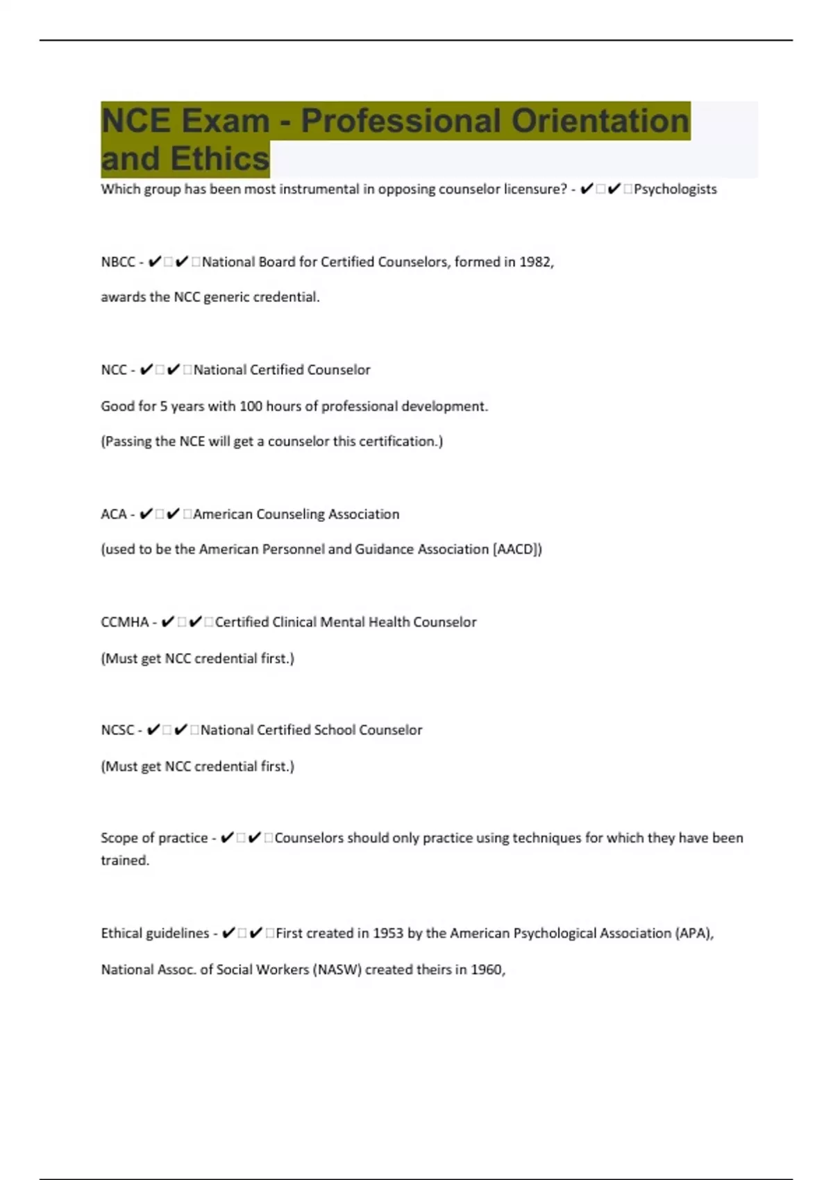 Which group has been most instrumental in opposing counselor licensure? - ️️Psychologists NBCC - ️️National Board for Certified Counselors, formed in 1982, awards the NCC generic credential. NCC - ️️National Certified Counselor Good for 5 years with 100 hours of professional development. (Passing the NCE will get a counselor this certification.) ACA - ️️American Counseling Association (used to be the American Personnel and Guidance Association [AACD]) CCMHA - ️️Certified Clinical Mental Health Counselor (Must get NCC credential first.) NCSC - ️️National Certified School Counselor (Must get NCC credential first.) Scope of practice - ️️Counselors should only practice using techniques for which they have been trained. Ethical guidelines - ️️First created in 1953 by the American Psychological Association (APA),