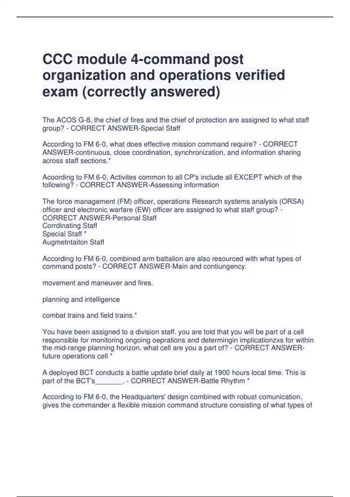 CCC module 4-command post organization and operations verified exam (correctly answered) The ACOS G-8, the chief of fires and the chief of protection are assigned to what staff group? - CORRECT ANSWER-Special Staff According to FM 6-0, what does effective mission command require? - CORRECT ANSWER-continuous, close coordination, synchronization, and information sharing across staff sections.* Acoording to FM 6-0, Activites common to all CP's include all EXCEPT which of the following? - CORRECT ANSWER-Assessing information The force management (FM) officer, operations Research systems analysis (ORSA) officer and electronic warfare (EW) officer are assigned to what staff group? - CORRECT ANSWER-Personal Staff Corrdinating Staff Special Staff * Augmetntaiton Staff According to FM 6-0, combined arm battalion are also resourced with what types of command posts? - CORRECT ANSWER-Main and contiungency. movement and maneuver and fires. planning and intelligence combat trains and field trains.* You have been assigned to a division staff. you are told that you will be part of a cell responsible for monitoring ongoing oeprations and determingin implicationzxs for within the mid-range planning horizon. what cell are you a part of? - CORRECT ANSWERfuture operations cell * A deployed BCT conducts a battle update brief daily at 1900 hours local time. This is part of the BCT's_______. - CORRECT ANSWER-Battle
