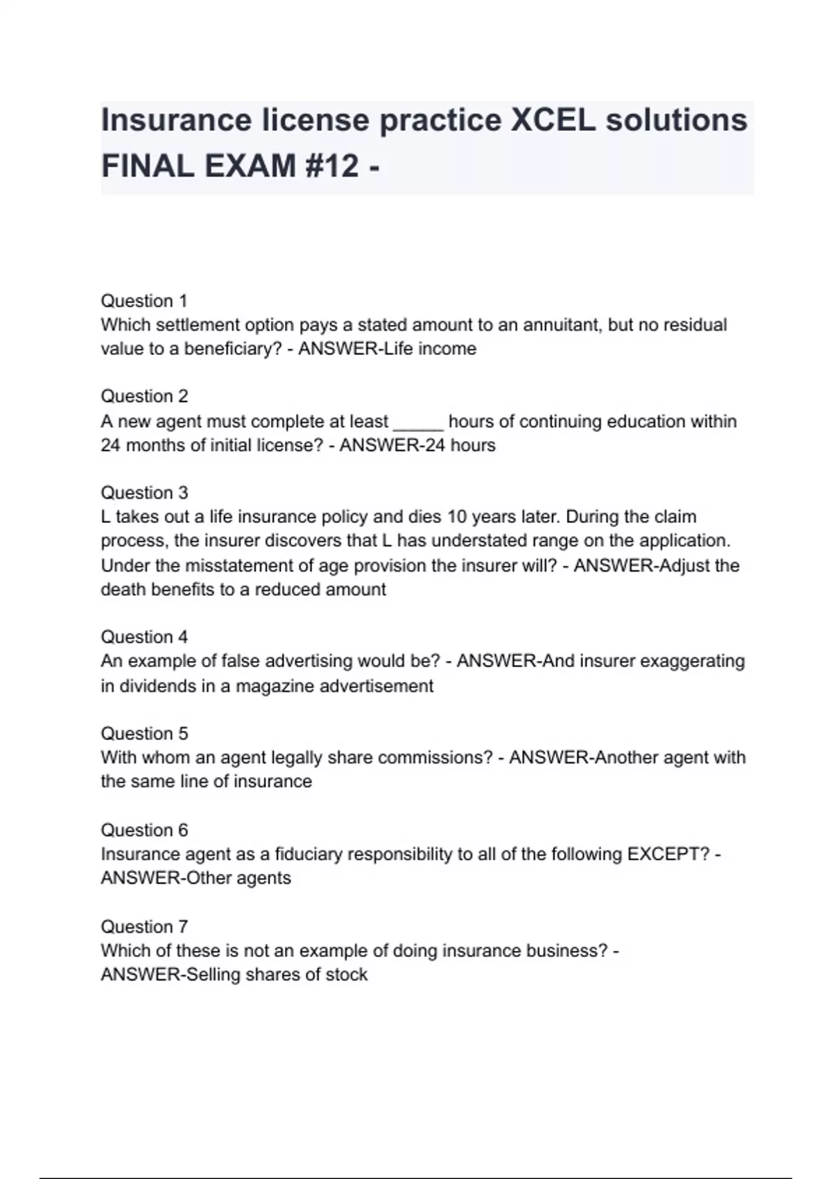 Insurance license practice XCEL solutions FINAL EXAM #12 - questions and answers