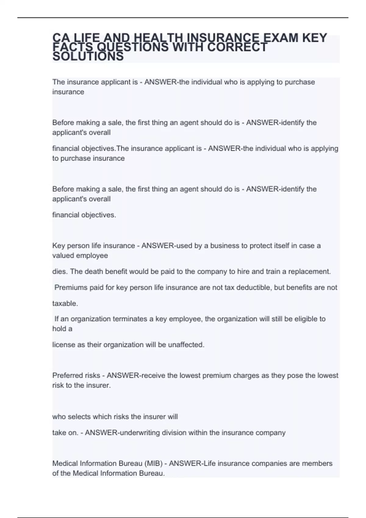 The insurance applicant is - ANSWER-the individual who is applying to purchase insurance Before making a sale, the first thing an agent should do is - ANSWER-identify the applicant's overall financial objectives.The insurance applicant is - ANSWER-the individual who is applying to purchase insurance Before making a sale, the first thing an agent should do is - ANSWER-identify the applicant's overall financial objectives. Key person life insurance - ANSWER-used by a business to protect itself in case a valued employee dies. The death benefit would be paid to the company to hire and train a replacement. Premiums paid for key person life insurance are not tax deductible, but benefits are not taxable. If an organization terminates a key employee, the organization will still be eligible to hold a license as their organization will be unaffected. Preferred risks - ANSWER-receive the lowest premium charges as they pose the lowest risk to the insurer. who selects which risks the insurer will take on. - ANSWER-underwriting division within the insurance company Medical Information Bureau (MIB) - ANSWER-Life insurance companies are members of the Medical Information Bureau.