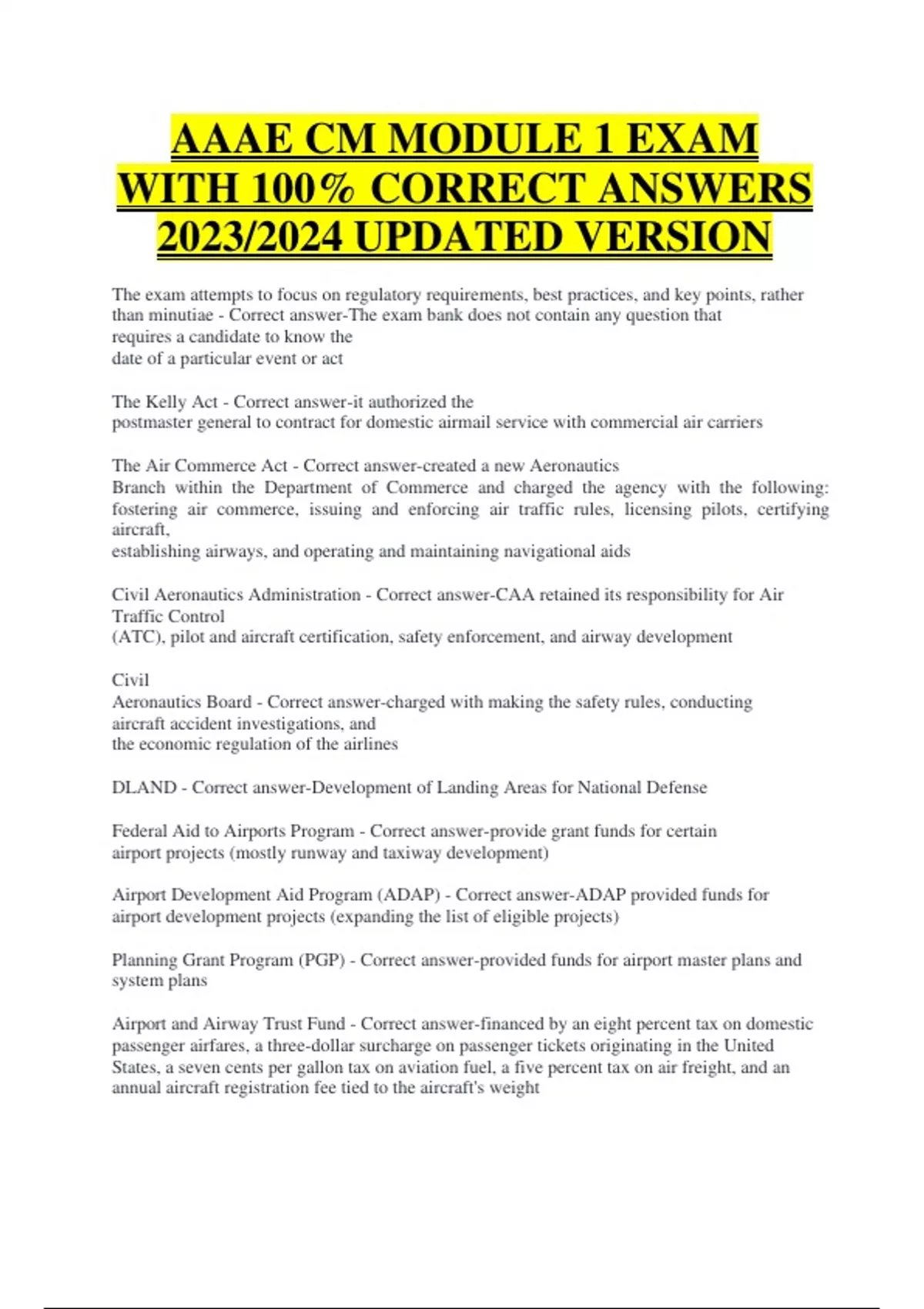 AAAE CM MODULE 1 EXAM WITH 100% CORRECT ANSWERS 2023/2024 UPDATED VERSION The exam attempts to focus on regulatory requirements, best practices, and key points, rather than minutiae - Correct answer-The exam bank does not contain any question that requires a candidate to know the date of a particular event or act The Kelly Act - Correct answer-it authorized the postmaster general to contract for domestic airmail service with commercial air carriers The Air Commerce Act - Correct answer-created a new Aeronautics Branch within the Department of Commerce and charged the agency with the following: fostering air commerce, issuing and enforcing air traffic rules, licensing pilots, certifying aircraft, establishing airways, and operating and maintaining navigational aids Civil Aeronautics Administration - Correct answer-CAA retained its responsibility for Air Traffic Control (ATC), pilot and aircraft certification, safety enforcement, and airway development Civil Aeronautics Board - Correct answer-charged with making the safety rules, conducting aircraft accident investigations, and the economic regulation of the airlines