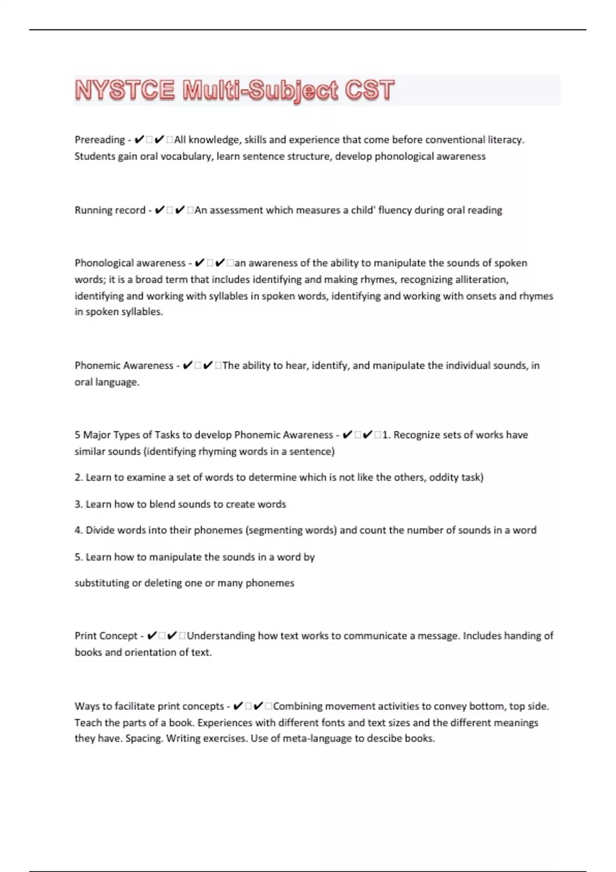 Prereading - ️️All knowledge, skills and experience that come before conventional literacy. Students gain oral vocabulary, learn sentence structure, develop phonological awareness Running record - ️️An assessment which measures a child' fluency during oral reading Phonological awareness - ️️an awareness of the ability to manipulate the sounds of spoken words; it is a broad term that includes identifying and making rhymes, recognizing alliteration, identifying and working with syllables in spoken words, identifying and working with onsets and rhymes in spoken syllables. Phonemic Awareness - ️️The ability to hear, identify, and manipulate the individual sounds, in oral language. 5 Major Types of Tasks to develop Phonemic Awareness - ️️1. Recognize sets of works have similar sounds (identifying rhyming words in a sentence) 2. Learn to examine a set of words to determine which is not like the others, oddity task) 3. Learn how to blend sounds to create words 4. Divide words into their phonemes (segmenting words) and count the number of sounds in a word 5. Learn how to manipulate the sounds in a word by substituting or deleting one or many phonemes Print Concept - ️️Understanding how text works to communicate a message. Includes handing of books and orientation of text. Ways to facilitate print concepts - ️️Combining movement activities to convey bottom, top side. Teach the parts of a book. Experiences with different fonts and text sizes and the different meanings they have. Spacing. Writing exercises. Use of meta-language to descibe books.