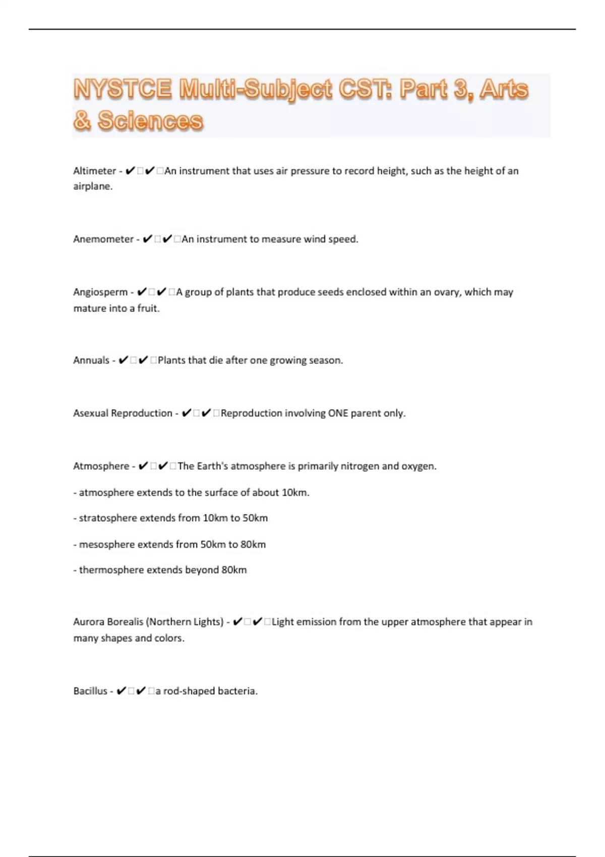 Altimeter - ️️An instrument that uses air pressure to record height, such as the height of an airplane. Anemometer - ️️An instrument to measure wind speed. Angiosperm - ️️A group of plants that produce seeds enclosed within an ovary, which may mature into a fruit. Annuals - ️️Plants that die after one growing season. Asexual Reproduction - ️️Reproduction involving ONE parent only. Atmosphere - ️️The Earth's atmosphere is primarily nitrogen and oxygen. - atmosphere extends to the surface of about 10km. - stratosphere extends from 10km to 50km - mesosphere extends from 50km to 80km - thermosphere extends beyond 80km Aurora Borealis (Northern Lights) - ️️Light emission from the upper atmosphere that appear in many shapes and colors. Bacillus - ️️a rod-shaped bacteria.