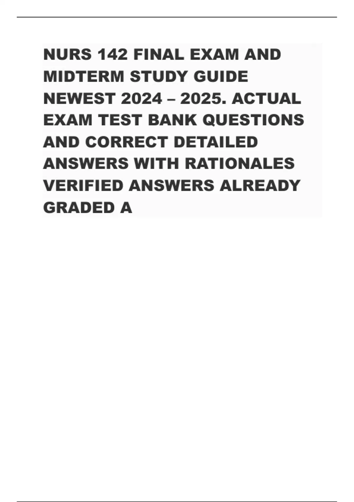 NURS 142 FINAL EXAM AND MIDTERM STUDY GUIDE NEWEST 2024 – 2025. ACTUAL EXAM TEST BANK QUESTIONS AND CORRECT DETAILED ANSWERS WITH RATIONALES VERIFIED ANSWERS ALREADY GRADED A
