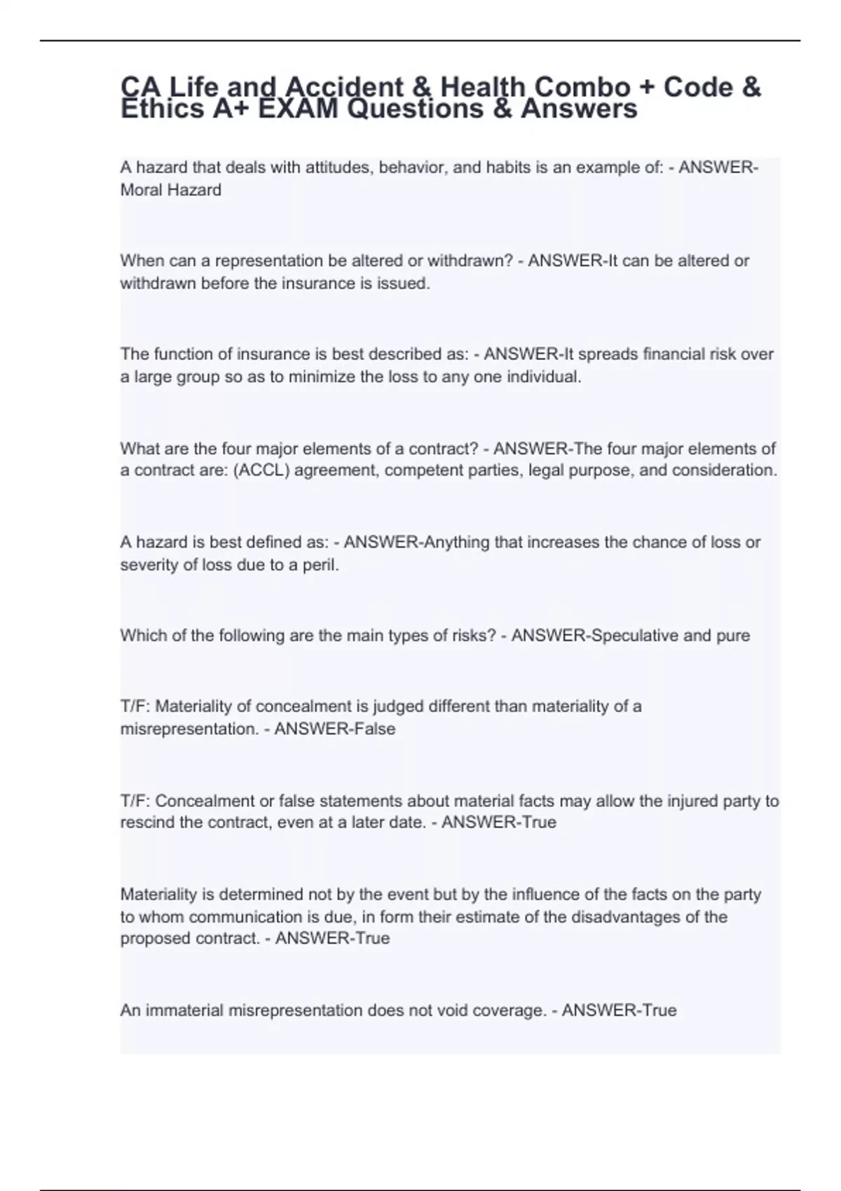 A hazard that deals with attitudes, behavior, and habits is an example of: - ANSWER-Moral Hazard When can a representation be altered or withdrawn? - ANSWER-It can be altered or withdrawn before the insurance is issued. The function of insurance is best described as: - ANSWER-It spreads financial risk over a large group so as to minimize the loss to any one individual. What are the four major elements of a contract? - ANSWER-The four major elements of a contract are: (ACCL) agreement, competent parties, legal purpose, and consideration. A hazard is best defined as: - ANSWER-Anything that increases the chance of loss or severity of loss due to a peril. Which of the following are the main types of risks? - ANSWER-Speculative and pure T/F: Materiality of concealment is judged different than materiality of a misrepresentation. - ANSWER-False T/F: Concealment or false statements about material facts may allow the injured party to rescind the contract, even at a later date. - ANSWER-True Materiality is determined not by the event but by the influence of the facts on the party to whom communication is due, in form their estimate of the disadvantages of the proposed contract. - ANSWER-True An immaterial misrepresentation does not void coverage. - ANSWER-True