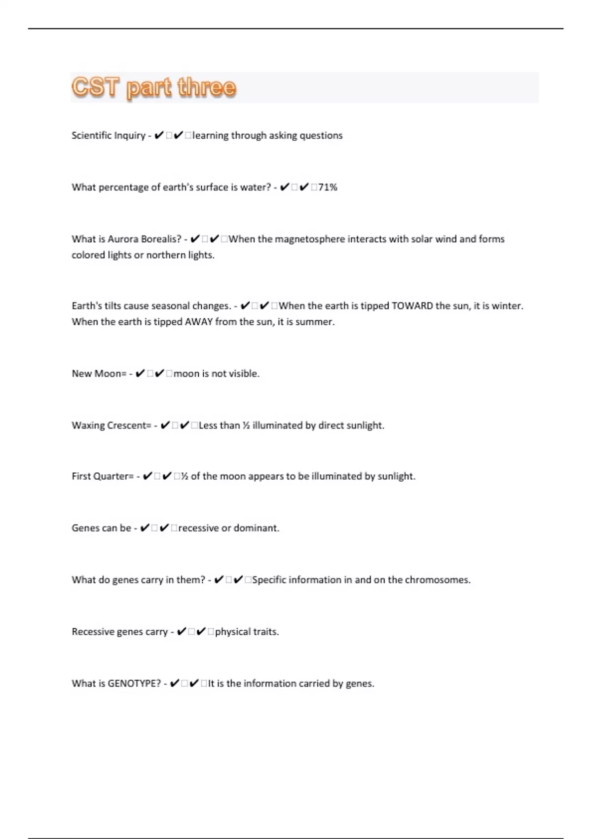 Scientific Inquiry - ️️learning through asking questions What percentage of earth's surface is water? - ️️71% What is Aurora Borealis? - ️️When the magnetosphere interacts with solar wind and forms colored lights or northern lights. Earth's tilts cause seasonal changes. - ️️When the earth is tipped TOWARD the sun, it is winter. When the earth is tipped AWAY from the sun, it is summer. New Moon= - ️️moon is not visible. Waxing Crescent= - ️️Less than ½ illuminated by direct sunlight. First Quarter= - ️️½ of the moon appears to be illuminated by sunlight. Genes can be - ️️recessive or dominant. What do genes carry in them? - ️️Specific information in and on the chromosomes. Recessive genes carry - ️️physical traits. What is GENOTYPE? - ️️It is the information carried by genes.