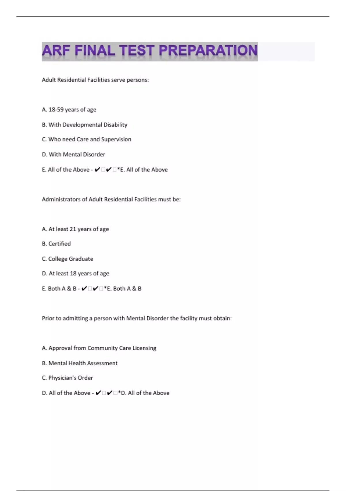 Adult Residential Facilities serve persons: A. 18-59 years of age B. With Developmental Disability C. Who need Care and Supervision D. With Mental Disorder E. All of the Above - ️️*E. All of the Above Administrators of Adult Residential Facilities must be: A. At least 21 years of age B. Certified C. College Graduate D. At least 18 years of age E. Both A & B - ️️*E. Both A & B Prior to admitting a person with Mental Disorder the facility must obtain: A. Approval from Community Care Licensing B. Mental Health Assessment C. Physician's Order D. All of the Above - ️️*D. All of the Above