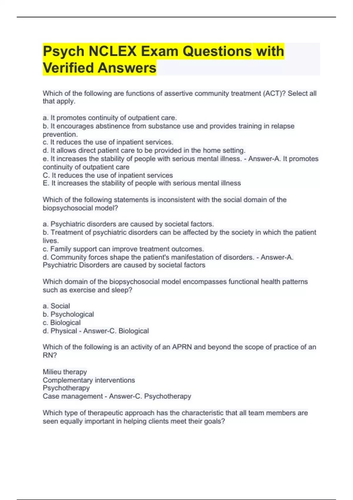 Psych NCLEX Exam Questions with Verified Answers Which part of Freud's personality structure is associated with ethics, standards, and self criticism? a. Superego b. Libido c. Ego d. Id - Answer-A. SuperEgo A patient diagnosed with a stroke is exhibiting expressive aphasia. Which of the following areas in the frontal lobe is responsible for the motor function of speech? Wernicke's Area Basil Ganglia Brocca's Area Limbic System - Answer-C. Brocca's Area A patient diagnosed with schizophrenia is hearing voices. The nurse would correlate this sensory dysfunction with which of the following cerebral lobes? Parietal Frontal Temporal Occipital - Answer-C. Temporal Which of the following parts of the brain is associated with multiple feelings and behaviors and is sometimes referred to as the emotional brain? Frontal Lobe Thalamus Hypothalamus Limbic System - Answer-D. Limbic System Which of the following parts of the brain is associated with voluntary body movement, thinking and judgment, and expression of feeling? Frontal lobe Parietal lobe Temporal lobe Occipital lobe - Answer-A. Frontal lobe Which of the following parts of the brain has control over the pituitary gland and autonomic nervous system? It also regulates appetite and temperature Temporal lobe Hippocampus Cerebellum Hypothalamus - Answer-D. Hypothalamus A decrease in which of the following neurotransmitters has been implicated in seizure disorder? GABA Dopamine Epinephrine Serotonin - Answer-A. GABA A decrease in which of the following neurotransmitters has been implicated in depression?
