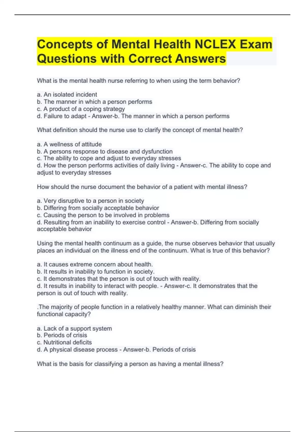 NCLEX Mental Health Exam Questions and Answers