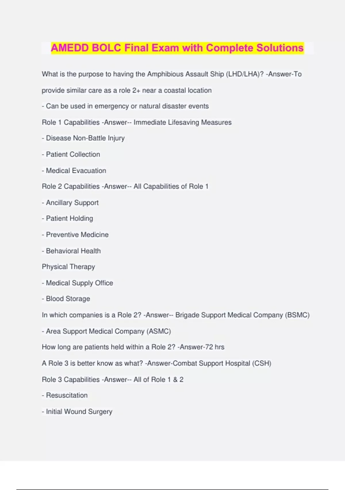 AMEDD BOLC Final Exam with Complete Solutions What is the purpose to having the Amphibious Assault Ship (LHD/LHA)? -Answer-To provide similar care as a role 2+ near a coastal location - Can be used in emergency or natural disaster events Role 1 Capabilities -Answer-- Immediate Lifesaving Measures - Disease Non-Battle Injury - Patient Collection - Medical Evacuation Role 2 Capabilities -Answer-- All Capabilities of Role 1 - Ancillary Support - Patient Holding - Preventive Medicine - Behavioral Health Physical Therapy - Medical Supply Office - Blood Storage In which companies is a Role 2? -Answer-- Brigade Support Medical Company (BSMC) - Area Support Medical Company (ASMC) How long are patients held within a Role 2? -Answer-72 hrs A Role 3 is better know as what? -Answer-Combat Support Hospital (CSH) Role 3 Capabilities -Answer-- All of Role 1 & 2 - Resuscitation - Initial Wound Surgery - Postoperative Treatment - Blood Bank How long are patients kept within a Role 3? -Answer-Until the patients are stabilized and are not expected to return to duty Where is FST attached? Where can it be assigned? What would that role be referred to as? -Answer-- Role 3 - Role 2 - Role 2 plus What is a Role 4? -Answer-A major hospital Define Health Service Support (HSS) -Answer-All support and services performed, provided, and arranged by the AMEDD to promote, improve, conserve, or restore the mental and physical well being of personnel in the Army. What 3 components encompass HSS? -Answer-- Casualty Care - Medical Evacuation (MEDEVAC) - Medical Logistics (MEDLOG) Define Force Health Protection (FHP) -Answer-The measures to promote, improve, or conserve the mental and physical well-being of Soldiers What 5 components encompass FHP? -Answer-- Preventive Medicine - Veterinary Services - Laboratory Services - Dental Services - Combat and Operational Stress Control (COSC) What are the roles of the Command Surgeon? -Answer-- Supervises medical operations within the command (is not a commander) What is the purpose of the Modular Medial System? -Answer-- Standardizes all medical sub-units - Designed to allow medical planners acquire, receive, and triage patients What squads does an Area Support Section consist of? -Answer-- Treatment Squad - Area Support Squad - Patient Holding Squad What is the role of the Nurse Corps Officer within a Medical Company? -Answer-- Authority to triage - Responsible for patient holding Basic Army Element Symbols - Ø - • - •• - ••• - l - ll - lll - X - XX - XXX -Answer-- Ø Team - • Squad - •• Section - ••• Platoon