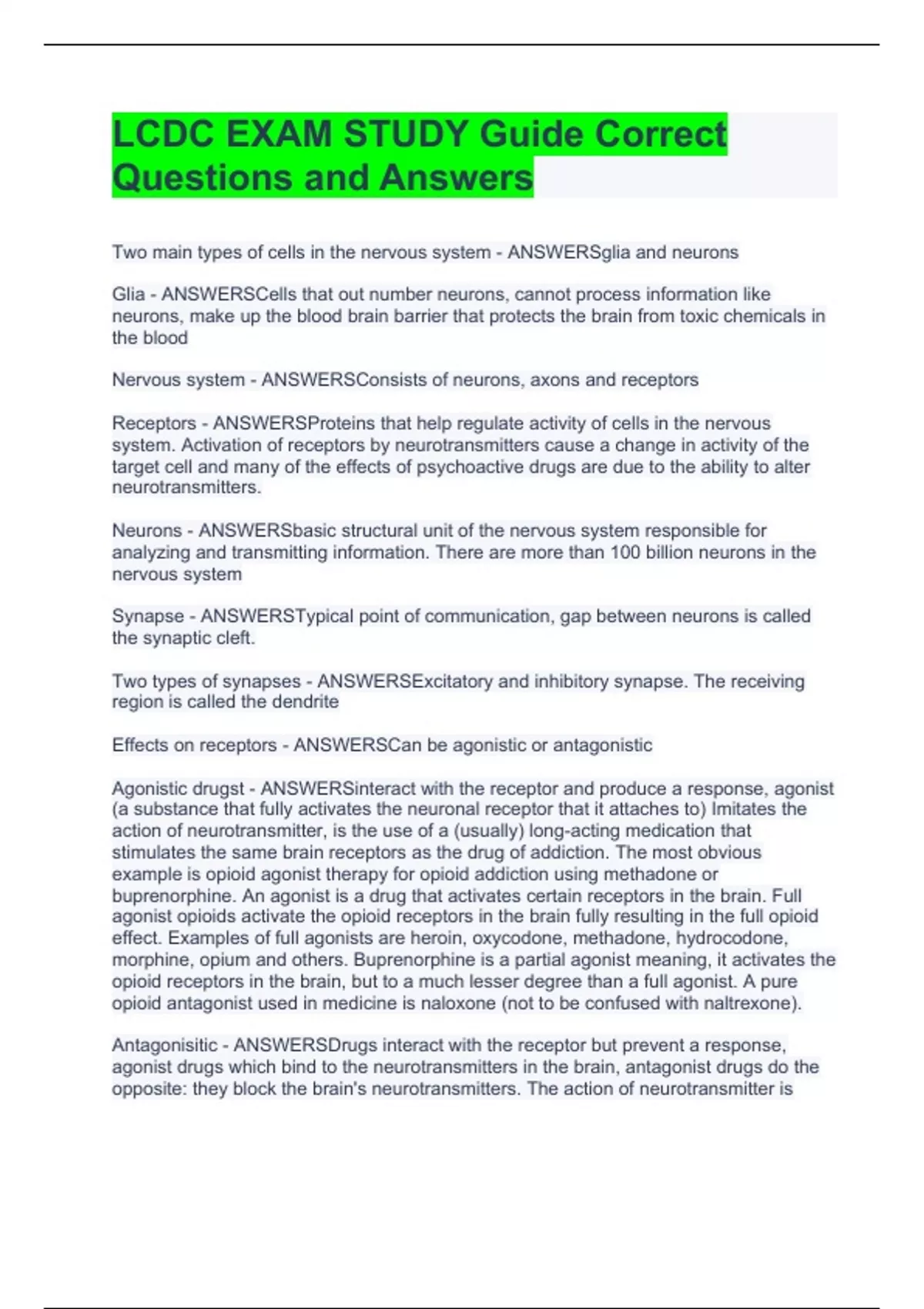 LCDC EXAM STUDY Guide Correct Questions and Answers Two main types of cells in the nervous system - ANSWERSglia and neurons Glia - ANSWERSCells that out number neurons, cannot process information like neurons, make up the blood brain barrier that protects the brain from toxic chemicals in the blood Nervous system - ANSWERSConsists of neurons, axons and receptors Receptors - ANSWERSProteins that help regulate activity of cells in the nervous system. Activation of receptors by neurotransmitters cause a change in activity of the target cell and many of the effects of psychoactive drugs are due to the ability to alter neurotransmitters. Neurons - ANSWERSbasic structural unit of the nervous system responsible for analyzing and transmitting information. There are more than 100 billion neurons in the nervous system Synapse - ANSWERSTypical point of communication, gap between neurons is called the synaptic cleft. Two types of synapses - ANSWERSExcitatory and inhibitory synapse. The receiving region is called the dendrite Effects on receptors - ANSWERSCan be agonistic or antagonistic Agonistic drugst - ANSWERSinteract with the receptor and produce a response, agonist (a substance that fully activates the neuronal receptor that it attaches to) Imitates the action of neurotransmitter, is the use of a (usually) long-acting medication that stimulates the same brain receptors as the drug of addiction. The most obvious example is opioid agonist therapy for opioid addiction using methadone or buprenorphine. An agonist is a drug that activates certain receptors in the brain. Full agonist opioids activate the opioid receptors in the brain fully resulting in the full opioid effect. Examples of full agonists are heroin, oxycodone, methadone, hydrocodone, morphine, opium and others. Buprenorphine is a partial agonist meaning, it activates the opioid receptors in the brain, but to a much lesser degree than a full agonist. A pure opioid antagonist used in medicine is naloxone (not to be confused with naltrexone). Antagonisitic - ANSWERSDrugs interact with the receptor but prevent a response, agonist drugs which bind to the neurotransmitters in the brain, antagonist drugs do the opposite: they block the brain's neurotransmitters. The action of neurotransmitter is obstructed. Buprenorphine also acts as an antagonist, meaning it blocks other opioids,