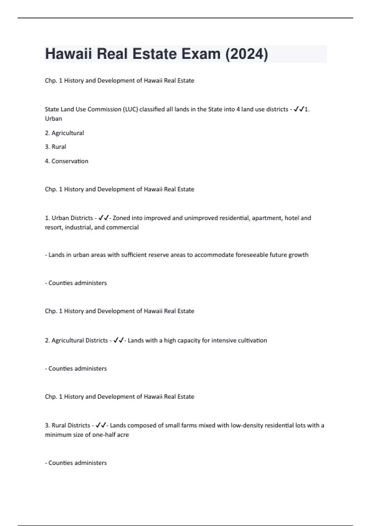 Chp. 1 History and Development of Hawaii Real Estate State Land Use Commission (LUC) classified all lands in the State into 4 land use districts - 1. Urban 2. Agricultural 3. Rural 4. Conservation Chp. 1 History and Development of Hawaii Real Estate 1. Urban Districts - - Zoned into improved and unimproved residential, apartment, hotel and resort, industrial, and commercial - Lands in urban areas with sufficient reserve areas to accommodate foreseeable future growth - Counties administers Chp. 1 History and Development of Hawaii Real Estate 2. Agricultural Districts - - Lands with a high capacity for intensive cultivation - Counties administers Chp. 1 History and Development of Hawaii Real Estate 3. Rural Districts - - Lands composed of small farms mixed with low-density residential lots with a minimum size of one-half acre - Counties administersChp. 1 History and Development of Hawaii Real Estate 4. Conservation Districts - - Lands in the existing forest and water reserve zones - State administers Chp. 2 Land, Land Elements, and Water Land (simplest definition) - Earth's surface and extension up to infinity and downward to center of the earth