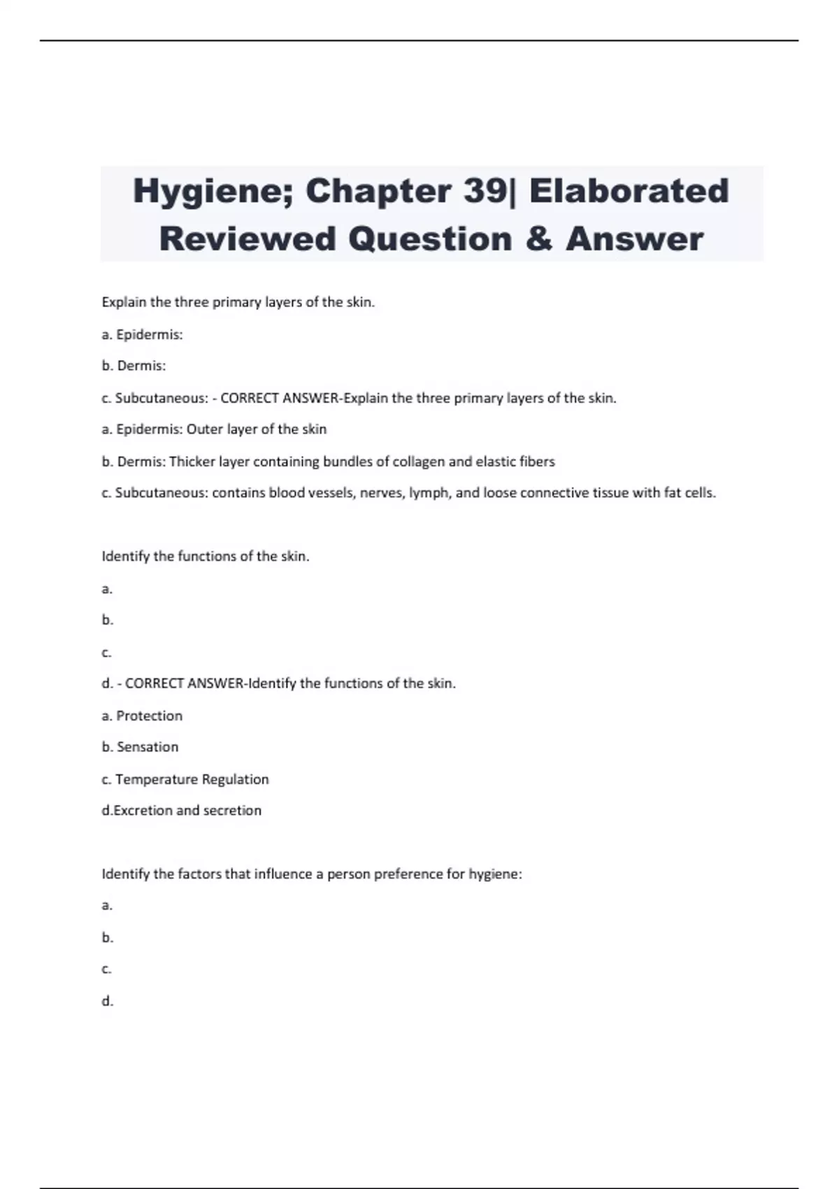 Hygiene; Chapter 39| Elaborated Reviewed Question & Answer Explain the three primary layers of the skin. a. Epidermis: b. Dermis: c. Subcutaneous: - CORRECT ANSWER-Explain the three primary layers of the skin. a. Epidermis: Outer layer of the skin b. Dermis: Thicker layer containing bundles of collagen and elastic fibers c. Subcutaneous: contains blood vessels, nerves, lymph, and loose connective tissue with fat cells. Identify the functions of the skin. a. b. c. d. - CORRECT ANSWER-Identify the functions of the skin. a. Protection b. Sensation c. Temperature Regulation d.Excretion and secretion Identify the factors that influence a person preference for hygiene: a. b. c. d