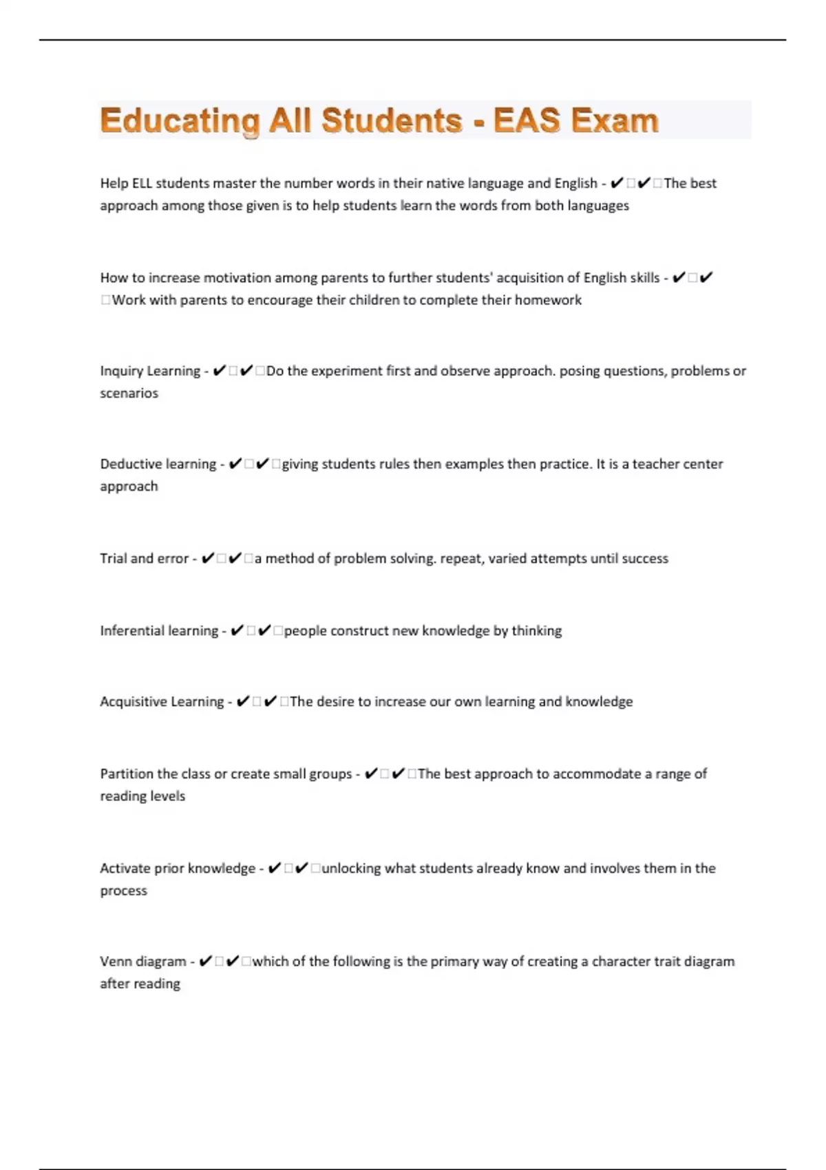 Help ELL students master the number words in their native language and English - ️️The best approach among those given is to help students learn the words from both languages How to increase motivation among parents to further students' acquisition of English skills - ️️Work with parents to encourage their children to complete their homework Inquiry Learning - ️️Do the experiment first and observe approach. posing questions, problems or scenarios Deductive learning - ️️giving students rules then examples then practice. It is a teacher center approach Trial and error - ️️a method of problem solving. repeat, varied attempts until success Inferential learning - ️️people construct new knowledge by thinking Acquisitive Learning - ️️The desire to increase our own learning and knowledge Partition the class or create small groups - ️️The best approach to accommodate a range of reading levels Activate prior knowledge - ️️unlocking what students already know and involves them in the process Venn diagram - ️️which of the following is the primary way of creating a character trait diagram after reading